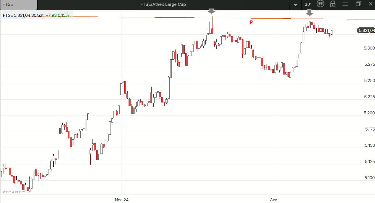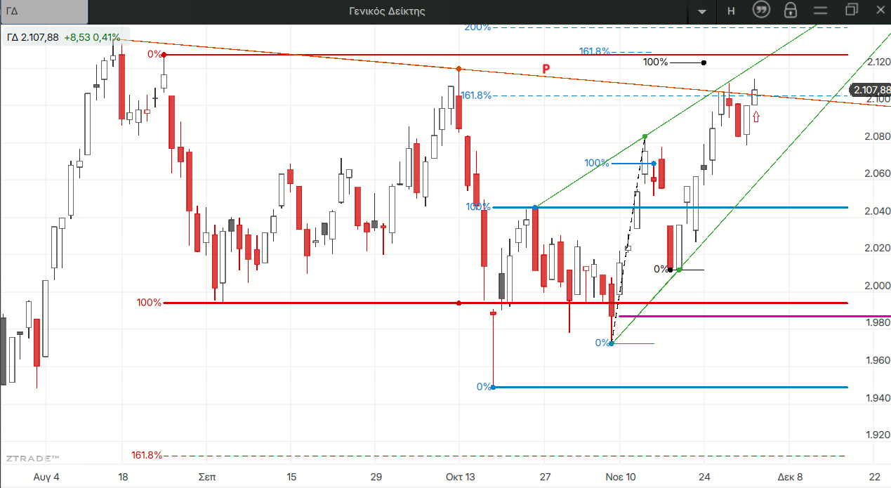 Μετά από 3 συνεδριάσεις οι τιμές σταμάτησαν και πάλι στην Ρ που ενώνει τις δυο προηγούμενες κορυφές της περιόδου μετά τα ψηλά του Αυγούστου και υποχώρησαν και πάλι άμεσα. Κατάσταση αναμονής εν μέσω ανοδικής τάσης πέριξ του 1ου στόχου του τελευταίου σχηματισμού διπλού πυθμένα. Ο πυθμένας της συνεδρίασης της Δευτέρας παρουσιάζει πλέον ενδιαφέρον αφού τυχόν υποχώρηση των τιμών χαμηλότερα ενεργοποιεί μίνι σχηματισμό διπλής κορυφής που θα θέσει σε αμφισβήτηση την βραχυπρόθεσμη τάση του δείκτη.