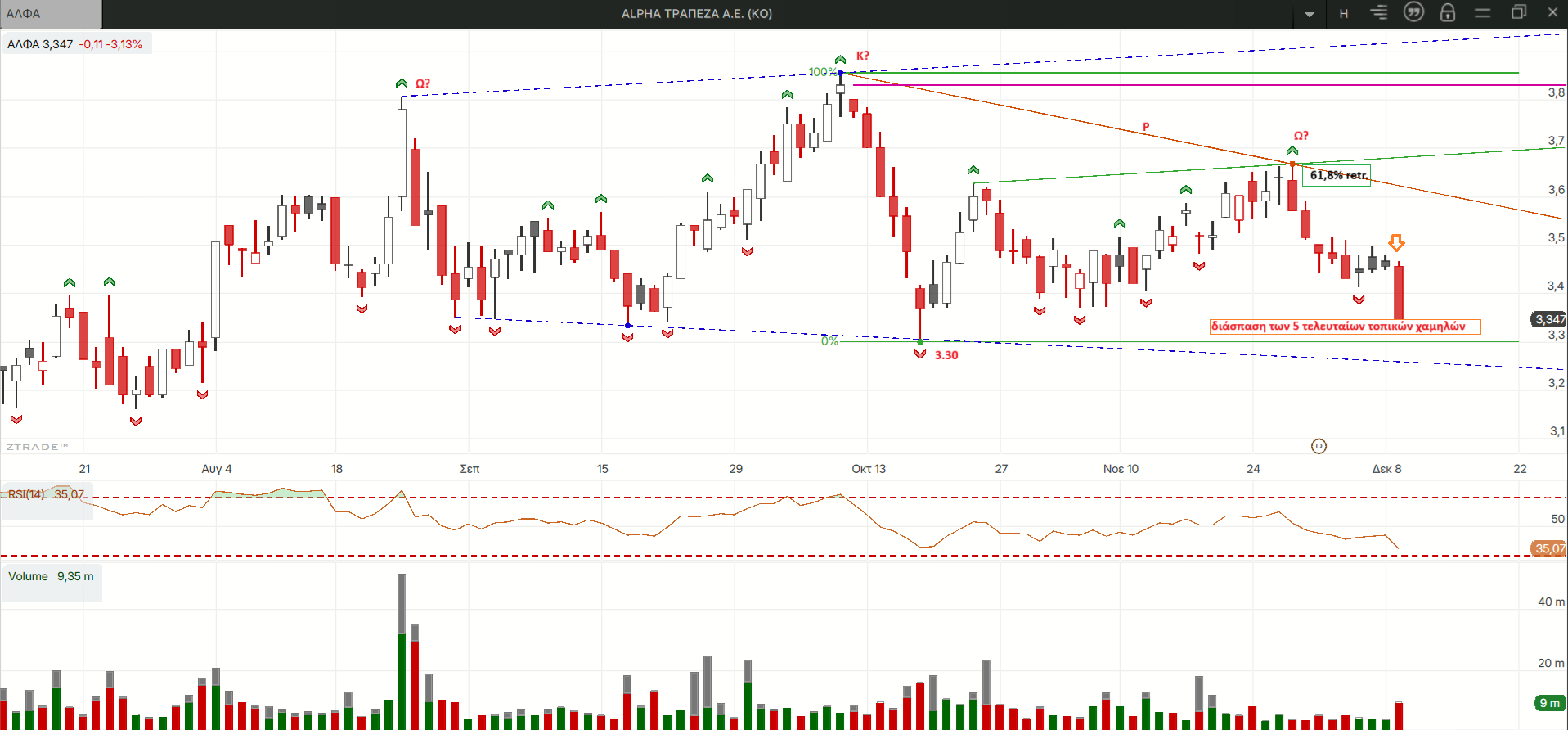 Καθοδική παραβίαση όλων των τελευταίων τοπικών χαμηλών μετά τα 3,30 ευρώ του Οκτωβρίου συνιστά απόδειξη ότι η τάση έχει αλλάξει στο ημερήσιο και κάνει το σενάριο ΩΚΩ να δείχνει πιθανό.
