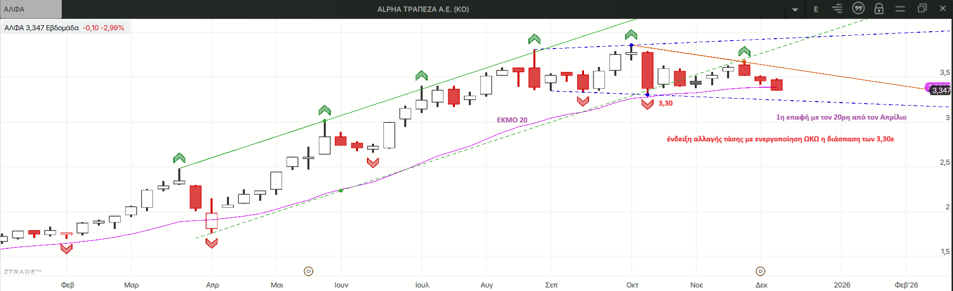 Επόμενο κρίσιμο σημείο τα 3,30 ευρώ κάτω από τα οποία θα έχουμε ένδειξη καθοδικής τάσης και για το εβδομαδιαίο και ενεργοποίηση του πτωτικού σεναρίου. Ήδη χθες οι τιμές διέσπασαν τον εβδομαδιαίο 20ρη για πρώτη φορά από τον Απρίλιο.