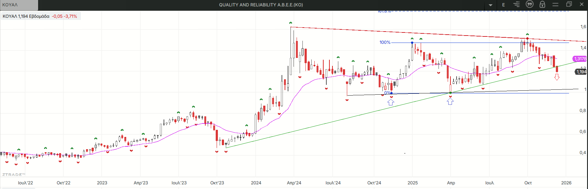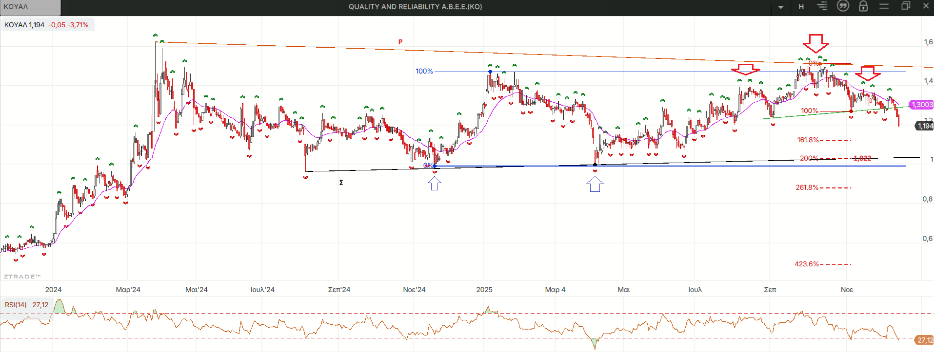 Ανατροπή εικόνας έχουμε εδώ και καιρό στην ΚΟΥΑΛ με την αγορά να δέχεται αρνητικά το θέμα της ΑΜΚ. Από την Παρασκευή έχουμε ενεργοποιημένο ένα ΩΚΩ που έχει θεωρητικό χειρότερο στόχο την επιστροφή στην Σ κοντά στη τιμή της ΑΜΚ. Σήμερα διασπάστηκε κι μεσομακροπρόθεσμη γραμμή τάσης του εβδομαδιαίου. Η τάση είναι καθοδική σε ημερήσιο κι εβδομαδιαίο.