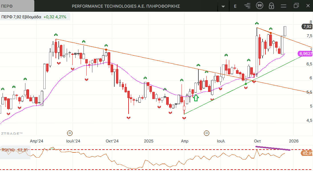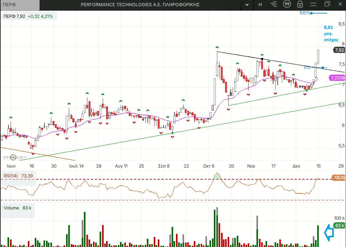 Από τους τίτλους που ξεχώρισαν θετικά θα δούμε τη ΠΕΡΦ στην οποία έχουμε από την Παρασκευή ανοδική διάσπαση του τριγώνου της και ένδειξη αλλαγή τάσης στο ημερήσιο που ήδη σήμερα επιβεβαιώθηκε αφού έκανε νέο ιστορικό υψηλό με μεγάλη αύξηση του όγκου.