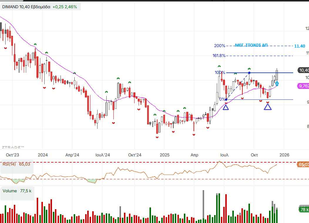 Αντίστοιχο σχηματισμό είχαμε και στην DIMAND που έκανε νέο υψηλό έτους κι έχει μέγιστο στόχο στα 11,40 ευρώ