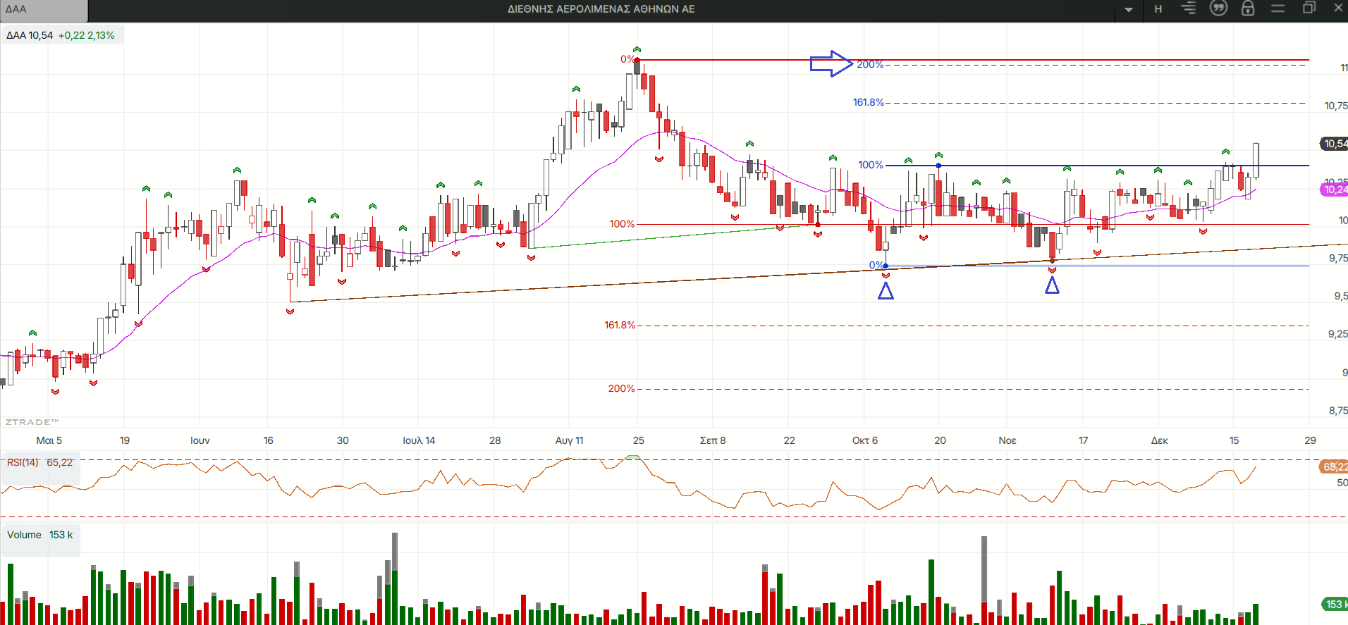 Στα αξιοσημείωτα της συνεδρίασης πέραν των νέου ιστορικού υψηλού της ΤΙΤΑΝ (και σε κλείσιμο), ήταν η ισχυρή αντίδραση των ΕΥΡΩΒ και ΕΤΕ καθώς και η ανοδική εικόνα στις ΕΕΕ, ΜΟΗ από τις δεικτοβαρείς μετοχές αλλά των ΣΑΡ, ΙΝΛΟΤ και ΔΑΑ στο διάγραμμα του οποίου που ακολουθεί θα δούμε ότι ενεργοποίησε σχηματισμό διπλού πυθμένα που έχει στόχο την επαναφορά των τιμών κοντά στο ιστορικό του υψηλό. Ο ΩΚΩ που είχε ενεργοποιηθεί τον Οκτώβριο δεν έδωσε τελικά κίνηση αφού οι τιμές δεν πλησίασαν ούτε τον ενδιάμεσο στόχο του.
