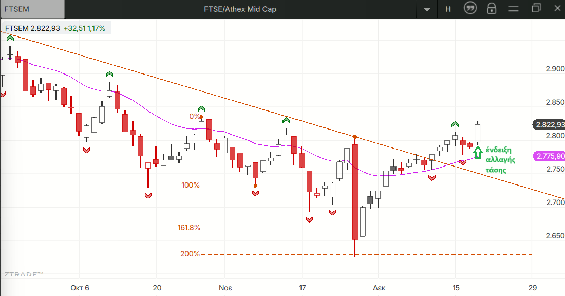 Τέλος θα δούμε και το δείκτη μεσαίας κεφαλαιοποίησης που είχε ένδειξη επιστροφής σε ανοδική τάση χάρις στην καλή απόδοση της ΙΝΛΟΤ κυρίως που τον διαμορφώνει κατά 25% περίπου κι ήταν αυτή που είχε στείλει την τιμή του στο στόχο της τελευταίας διπλής κορυφής από τον οποίο ξεκίνησε η ανοδική αντίδραση.