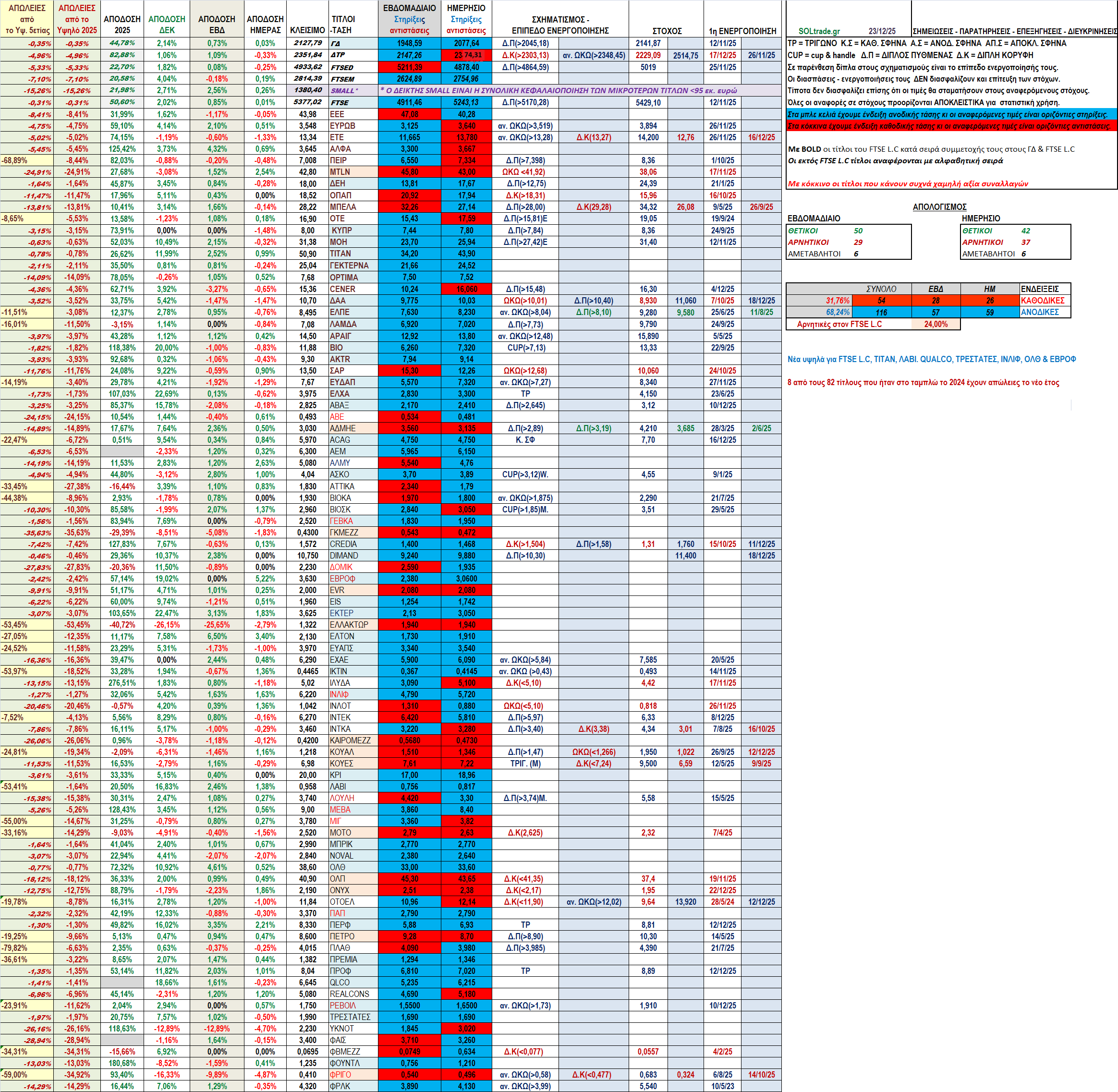 Στο πινακάκι συνοπτικής ανασκόπησης που ακολουθεί μπορούμε να δούμε τις αποδόσεις των τίτλων που τον απαρτίζουν στις 25 πρώτες θέσεις μετά τους δείκτες. H αγορά τα πήγε καλά το διήμερο της κουτσουρεμένης εβδομάδας όπως βλέπουμε στο απολογισμό με τη μεγάλη υπεροχή των τίτλων που είχαν θετική απόδοση. Στην 1η στήλη αναφέρονται κι οι απώλειες από το υψηλό που είχαν οι μετοχές μετά την πανδημία δεδομένου ότι 24 από αυτές δεν έκαναν φέτος το υψηλό αυτής της περιόδου.