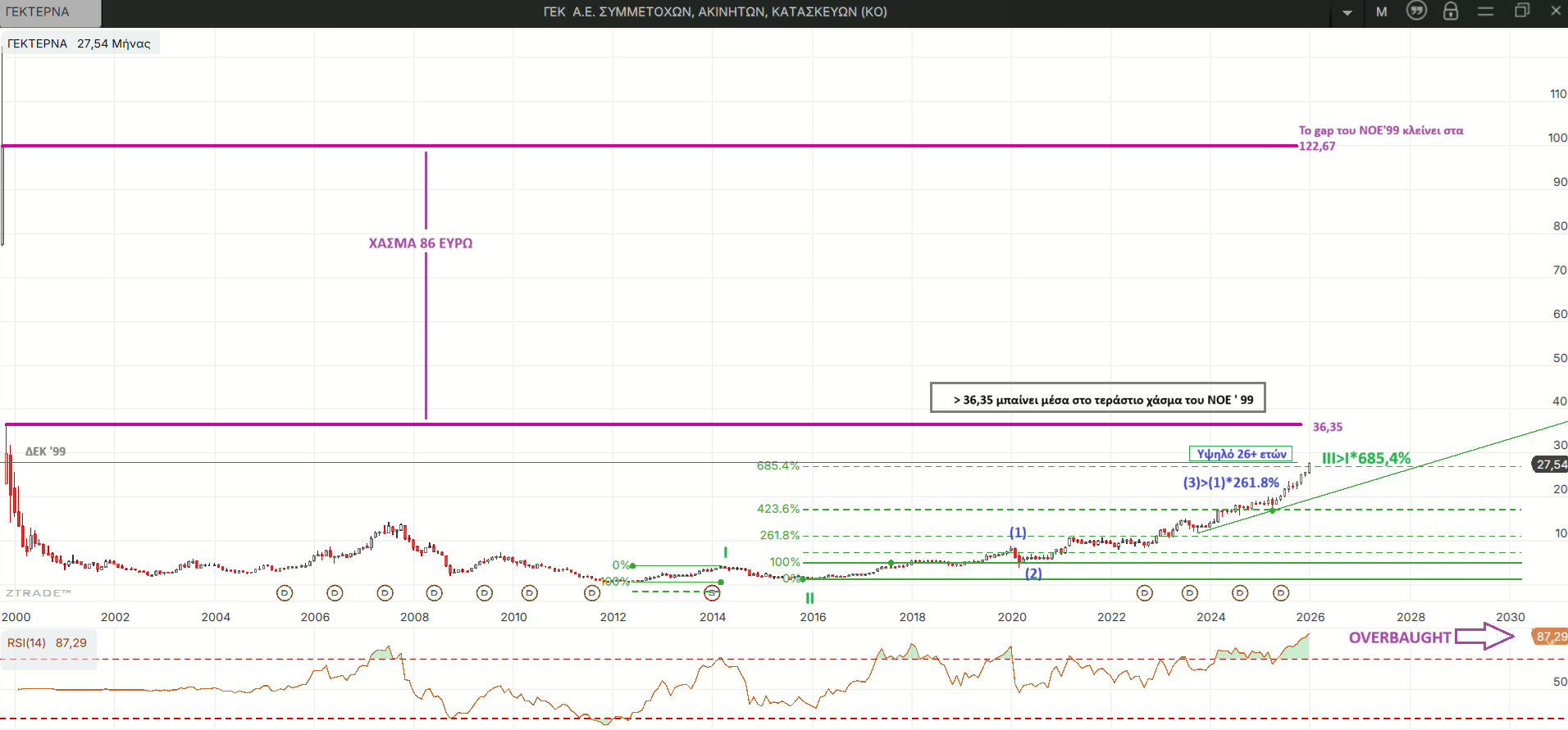 Μετά από το καλοκαίρι της τρέλας το 1999 η τιμή έπεσε από τα 519 του Αυγούστου στα 61 ευρώ του Σεπτεμβρίου και μετά από το τίναγμα της ψόφιας γάτας τον Οκτώβριο έκανε ένα τεράστιο πτωτικό χάσμα τον Νοέμβριο του 99 που περιγράφεται στο μηνιαίο ιστορικό διάγραμμα. Δεν ξέρω τι σημασία μπορεί να έχουν όλα αυτά αλλά οι τιμές μπαίνουν στο κάτω μέρος αυτού του χάσματος αν περάσουν τα 36,35 ευρώ που άρχισα να τα σκέφτομαι αφού φθάσαμε στα 27,54 και ίσως είναι πιθανό να βρισκόμαστε ακόμα στο μεγάλο κύμα ΙΙΙ της αντίδρασης από το ιστορικό χαμηλό του 2012, σύμφωνα με τις σημειώσεις στο διάγραμμα. Ήδη άρχισαν να ακούγονται από κάποιους “οίκους” κάτι τρελοί στόχοι αρκετά ψηλότερα κι έτσι είπα να κάτσω να μελετήσω λίγο την ιστορία του χαρτιού και να προσπαθήσω να κάνω μια κυματική εκτίμηση. Η τιμή βέβαια έχει εξαπλασιαστεί από τα χαμηλά του 2020 οπότε το ενδιαφέρον είναι μόνο θεωρητικό. Ο μηνιαίος RSI είναι στο 87 άλλωστε…