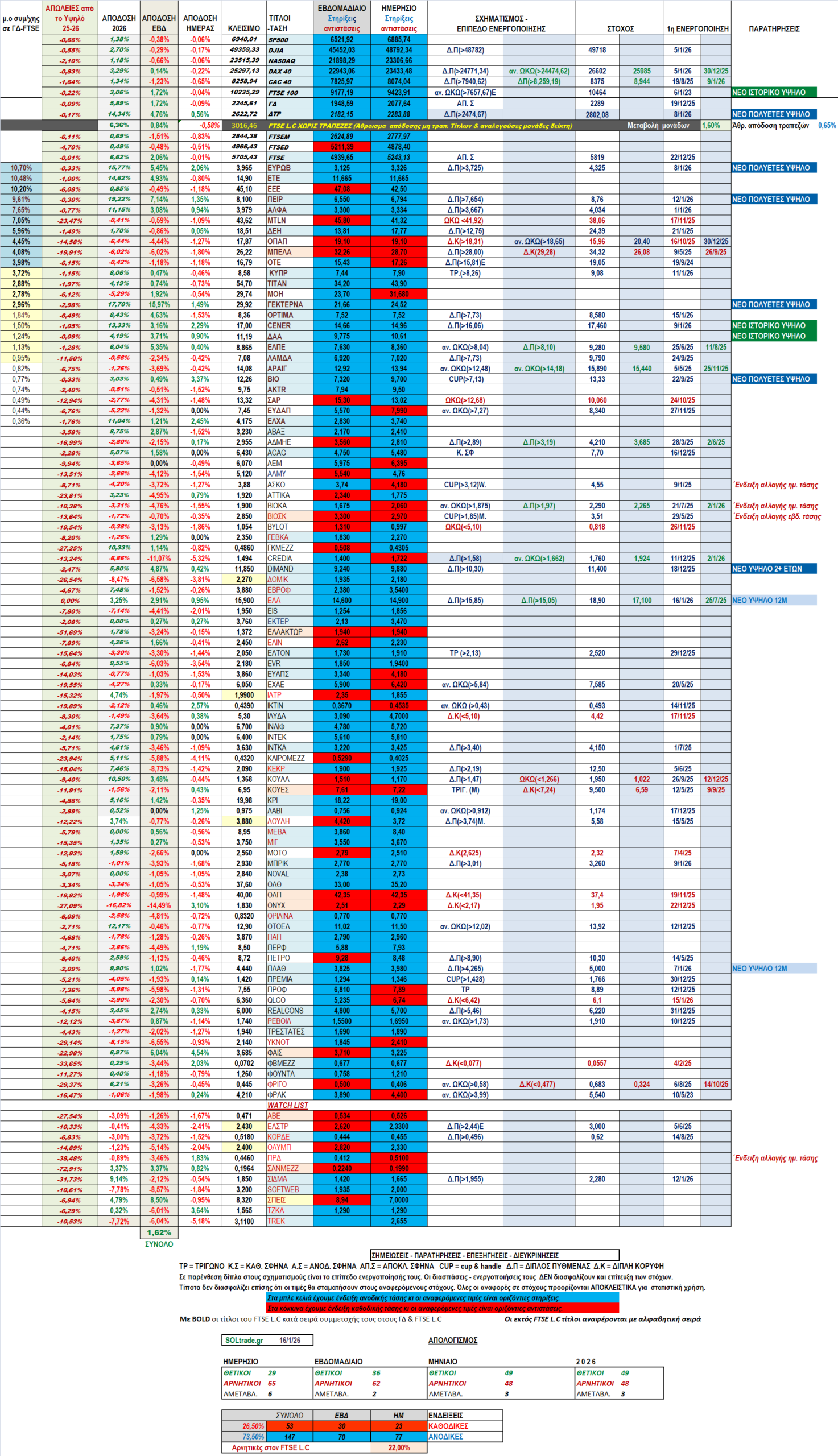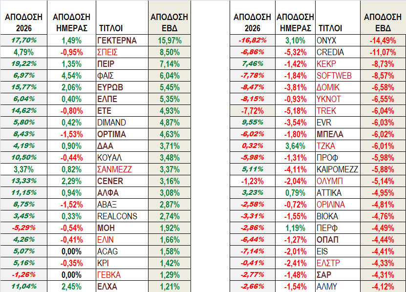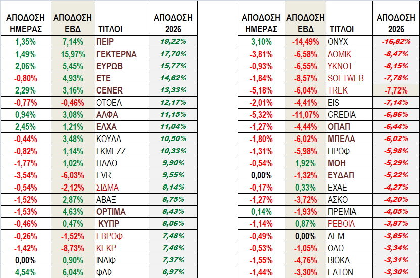Κανένα από τα βαριά χαρτιά της πρώτης δεκάδας του ΓΔ και του FTSE L.C πλην των τραπεζών δεν συμπεριλαμβάνεται στις κορυφαίες αποδόσεις του 2026 και της τελευταίας εβδομάδας ενώ δυο από αυτά, ο ΟΠΑΠ και η ΜΠΕΛΑ συμπεριλαμβάνονται στις λίστες με τις χαμηλότερες.