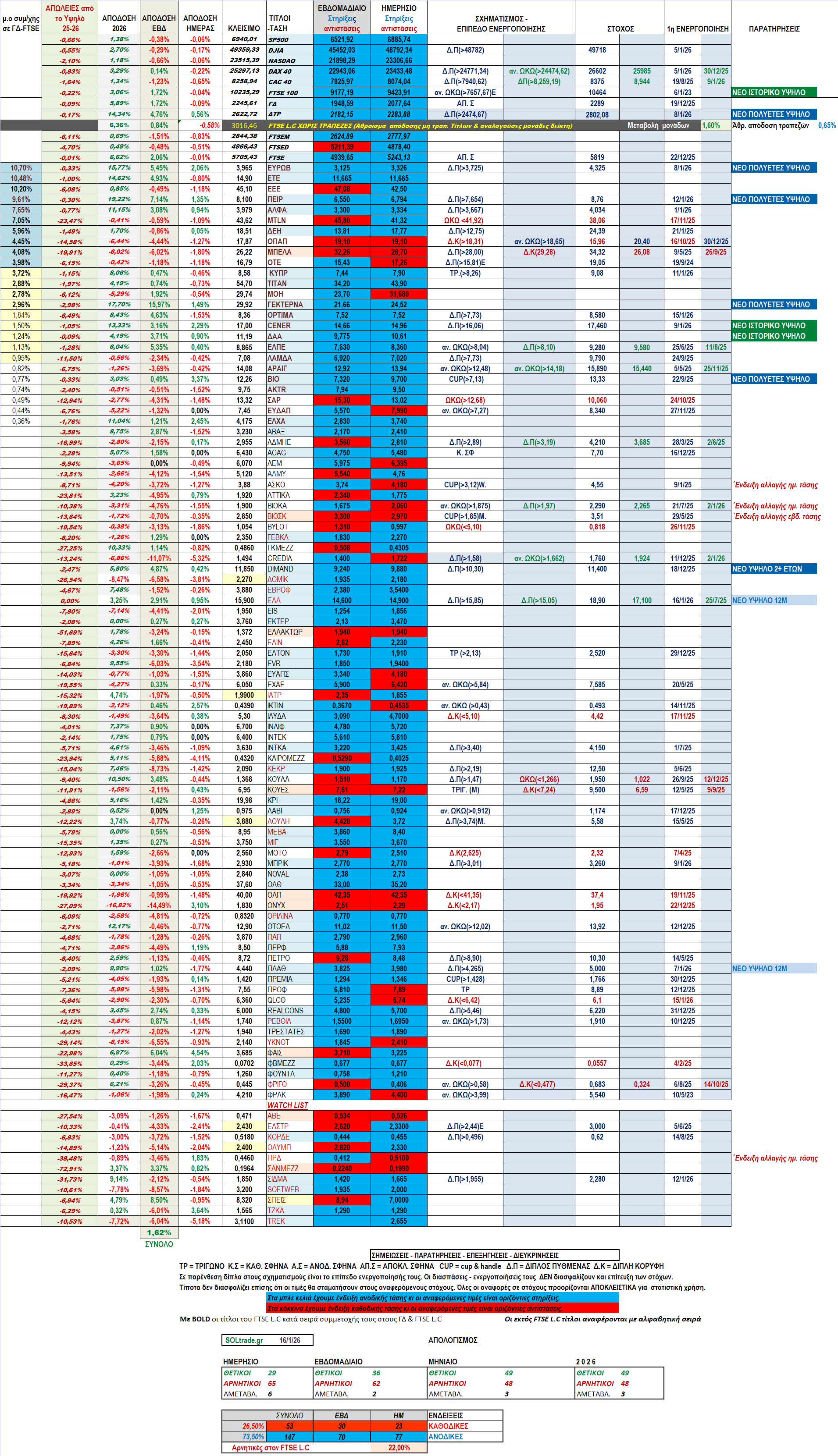 Τις αποδόσεις όλων των χαρτιών που παρακολουθούμε αλλά και των σημαντικότερων δεικτών της αγοράς και των 6 σημαντικότερων ξένων δεικτών μπορούμε να τις δούμε μαζί με πολλά άλλα δεδομένα στο πινακάκι συνοπτικής ανασκόπησης, επικαιροποιημένο μετά την τελευταία συνεδρίαση της εβδομάδας, που ακολουθεί. Η τελευταία συνεδρίαση αλλά και η δεύτερη εβδομάδα της νέας χρονιάς δεν πήγαν καλά για τη μεγάλη πλειοψηφία των μετοχών αλλά περισσότερο από το 72% των ενδείξεων τάσης από τα fractals παραμένει ανοδικό όπως μπορούμε να δούμε στο τέλος της συνοπτικής ανασκόπησης. Οι μη τραπεζικοί τίτλοι του FTSE L.C είχαν συνολικά αρνητική απόδοση την Παρασκευή σε αντίθεση με τον ΔΤΡ, ενώ και στο εβδομαδιαίο είχαν πολύ χαμηλότερη απόδοση, αν και θετική λόγω της έκρηξης της ΓΕΚΤΕΡΝΑ προφανώς. Καθαρά αρνητική απόδοση είχε επίσης ο FTSEM τόσο στην τελευταία συνεδρίαση όσο και και στο εβδομαδιαίο.
