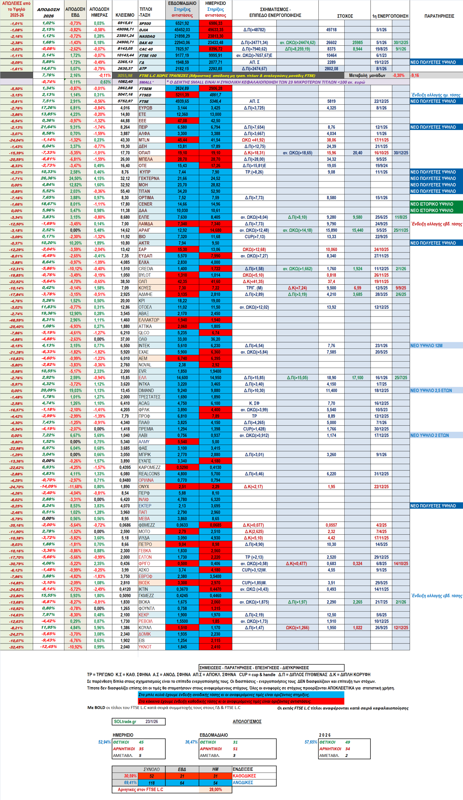 Στις λίστες που ακολουθούν μπορούμε να δούμε τις 20 κορυφαίες και 20 χαμηλότερες αποδόσεις τόσο κατά την τελευταία εβδομάδα όσο και για το νέο έτος