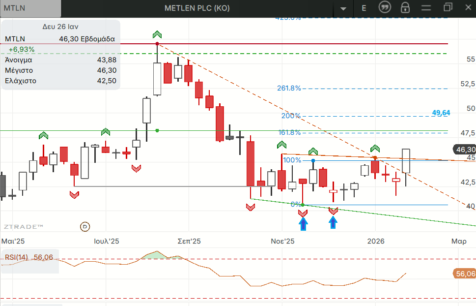 Σημαντική η χθεσινή συνεδρίαση για τη MTLN που δείχνει ότι μπορεί να βάλει τέλος στη συσσώρευση των τελευταίων μηνών. Οι τιμές διέσπασαν ανοδικά τα 3 τελευταία τοπικά υψηλά του εβδομαδιαίου με μεγάλο όγκο δίνοντας σαφή ένδειξη αλλαγής της τάσης και στο εβδομαδιαίο και ενεργοποίησαν και σχηματισμό διπλού πυθμένα με στόχο λίγο πριν τα 50 ευρώ.