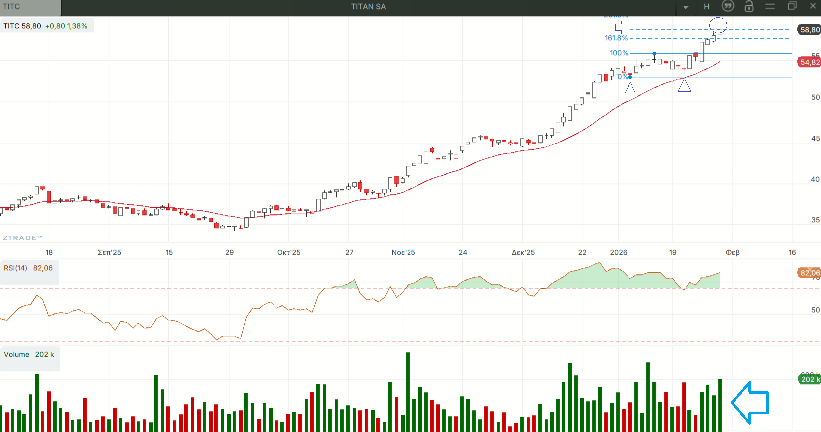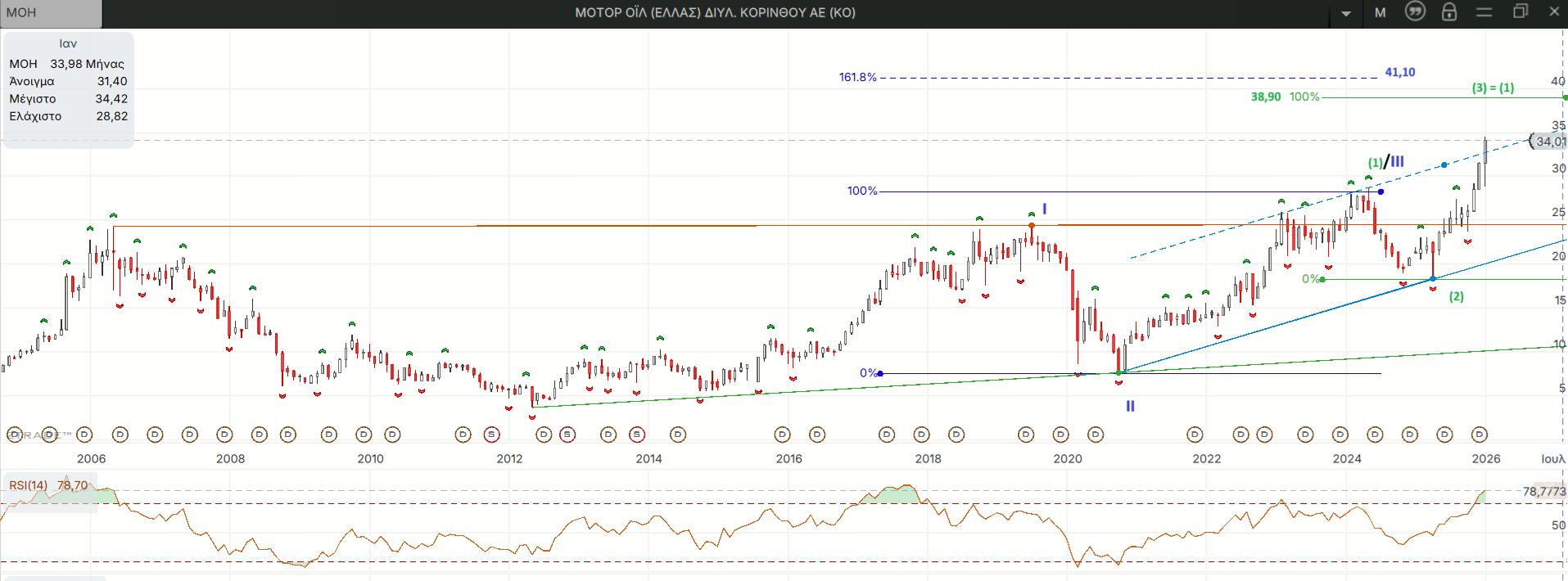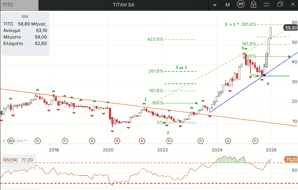 Οι σχηματισμοί έχουν πιάσει τους στόχους τους κι οι παράλληλες των ανοδικών γραμμών τάσης έχουν διασπαστεί οπότε κοιτάμε τα fibo extensions των πιθανολογούμενων κυμάτων της μεγάλης εικόνας για να δούμε τους πιθανούς επόμενους σταθμούς. Σημαντική και πάλι η αύξηση του όγκου και στις δυο μετοχές: