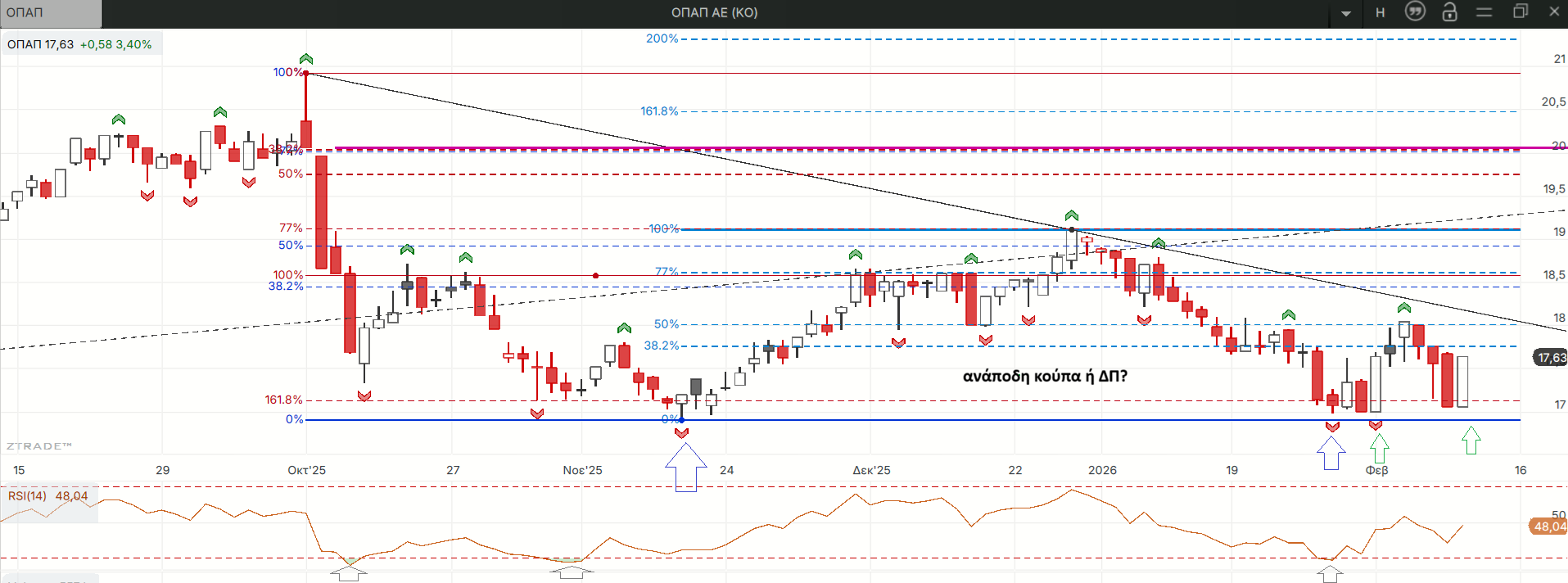 Από τις μετοχές που βρίσκονται σε καθοδική τάση θα ρίξουμε μια ματιά στα πιθανά σενάρια του ΟΠΑΠ που έχει ένα μικρό και ένα μεγάλο διπλό πυθμένα απέναντι σε μια πιθανή ανεστραμμένη CUP & HANDLE που ενεργοποιείται να παραβιαστούν αυτοί οι πυθμένες. Τυχόν διάσπαση της τελευταίας κορυφής στα 18,04 θα είναι σαφής ένδειξη αλλαγής της τάσης σε ανοδική.