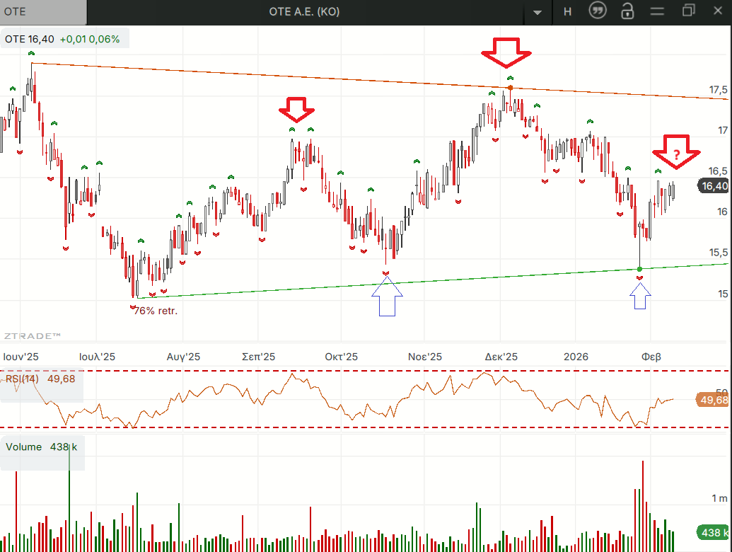 Αντίθετα σενάρια υπάρχουν και στον ΟΤΕ που κινείται μέσα στο ευρύ τρίγωνο που έχει σχηματιστεί το τελευταίο 6μηνο. Εδώ η τάση είναι πιθανόν να γίνεται ανοδική αν διασπαστεί το 16,49.