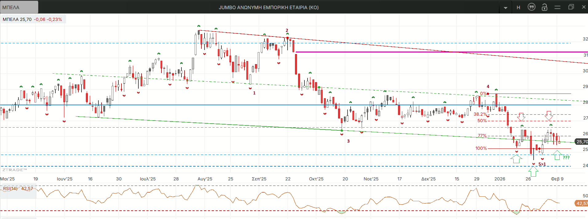 Θα δούμε επίσης και δυο αντίθετα σενάρια στη ΜΠΕΛΑ που θα μπορούσε να έχει ολοκληρώσει μια πεντακυματική πτωτική κίνηση στο πρόσφατο χαμηλό το οποίο θα μπορούσε με τη σειρά του να είναι η κεφαλή ενός ανάστροφου ΩΚΩ. Παραβίαση αυτού του χαμηλού βέβαια θα ενεργοποιούσε μια μίνι διπλή κορυφή. Ένδειξη αλλαγής της τάσης σε ανοδική θα αποτελέσει τυχόν ενεργοποίηση του ΩΚΩ.