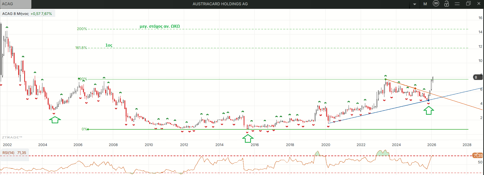 Μετά την επίτευξη του στόχου στα 7,70 ευρώ οι τιμές της ACAG ξεπέρασαν και αυτό το επίπεδο ενεργοποιώντας ένα μακροχρόνιο σχηματισμό ανοδικής αναστροφής 22 ετών από την εποχή της ΙΝFΟΡΜ ΛYKOΣ με πολύ φιλόδοξους στόχους και με τον μηνιαίο RSI να εισέρχεται μόλις στην υπεραγορασμένη ζώνη τιμών.