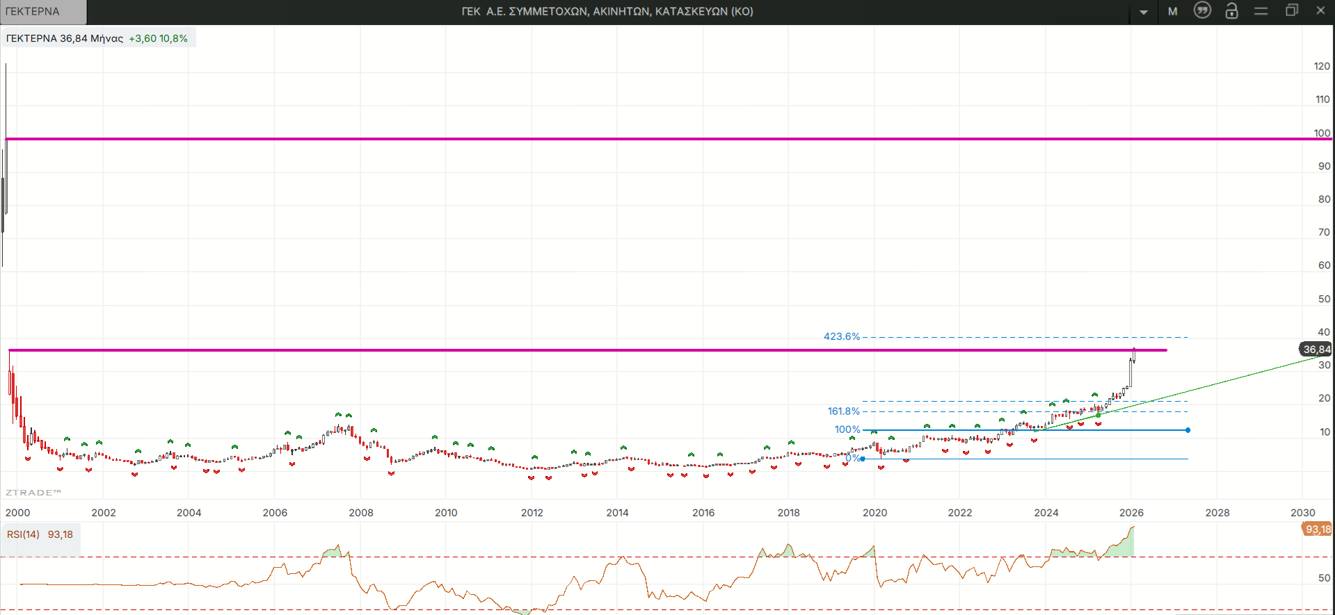 Εκτός των δυο αυτών μετοχών νέα υψηλά είχαμε και στις ΕΕΕ (που έκλεισε στο στόχο της), την AKTOR, την ΚΡΙ ΚΡΙ και την ΓΕΚΤΕΡΝΑ που συνεχίζει ακάθεκτη και κατάφερε χθες να μπει στο τεράστιο πτωτικό χάσμα του Νοέμβρη του 1999(!) καθ’ οδόν πιθανώς προς τα 40 ευρώ όπου έχουμε και το 423,6% του πρώτου μεγάλου ανοδικού κύματος, αλλά με τον μηνιαίο RSI να σπάει τα κοντέρ στο 93!
