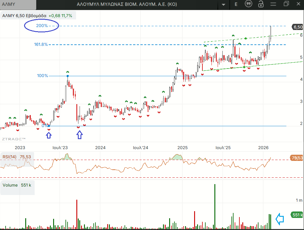 Πολύ καλή και η ΑΛΜΥ που πέτυχε το στόχο του διπλού πυθμένα του 2023 επίσης σε νέα πολυετή υψηλά και με τον εβδομαδιαίο RSI να εισέρχεται μόλις στην υπεραγορασμένη ζώνη τιμών επίσης.