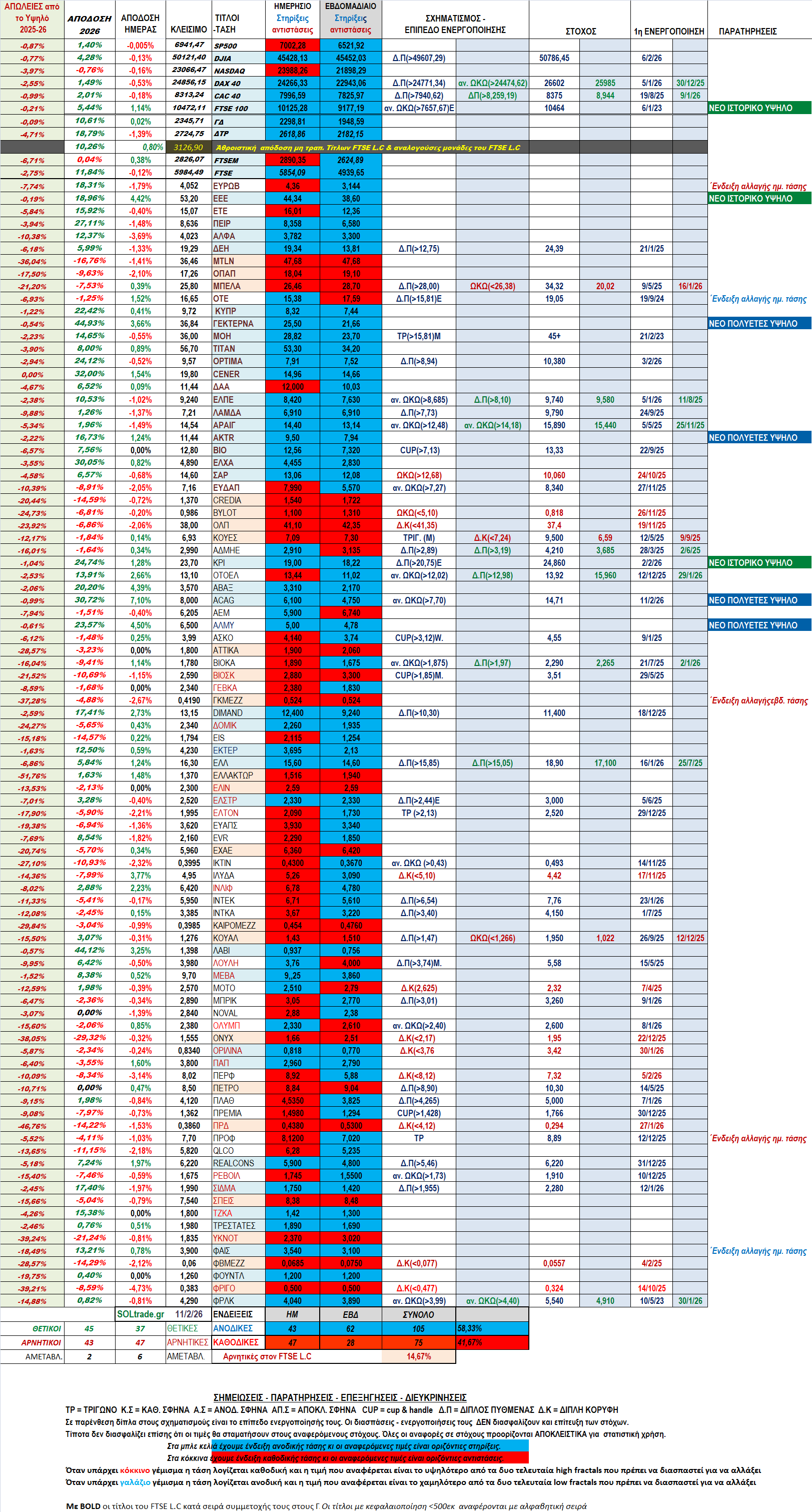 Από τους 90 τίτλους που παρακολουθούμε στο πινακάκι συνοπτικής ανασκόπησης που ακολουθεί επικαιροποιημένο είχαμε 10 περισσότερους με αρνητικό κλείσιμο από τους θετικούς. Στα αξιοσημείωτα είναι η διάσπαση της οριζόντιας αντίστασης του ημερήσιου στις τιμές του ΟΤΕ που αποτελεί ένδειξη αλλαγής της τάσης.