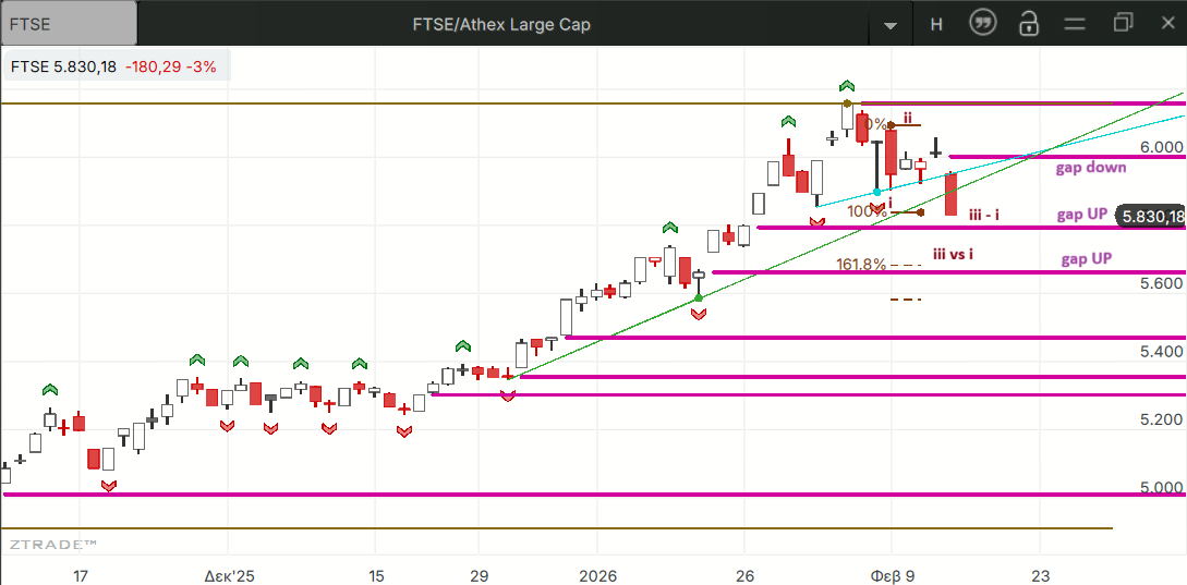 Σημαντική πτώση για ΔΤΡ, και κατά συνέπεια για ΓΔ και FTSE L.C στην τελευταία συνεδρίαση της εβδομάδας με τις τράπεζες, τη ΔΕΗ και την ΤΙΤΑΝ να έχουν σαφείς ενδείξεις ότι οι βραχυπρόθεσμη τάση έχει γίνει καθοδική με την παραβίαση στηρίξεων και την ενεργοποίηση καθοδικών σχηματισμών που “υπόσχονται” μεγαλύτερες εκπτώσεις. Όλες οι ενδείξεις αρνητικών αλλαγών έγιναν σε μετοχές του FTSE L.C και μπορούμε τις δούμε σημειωμένες στο πινακάκι συνοπτικής ανασκόπησης των δεικτών και των τίτλων του.