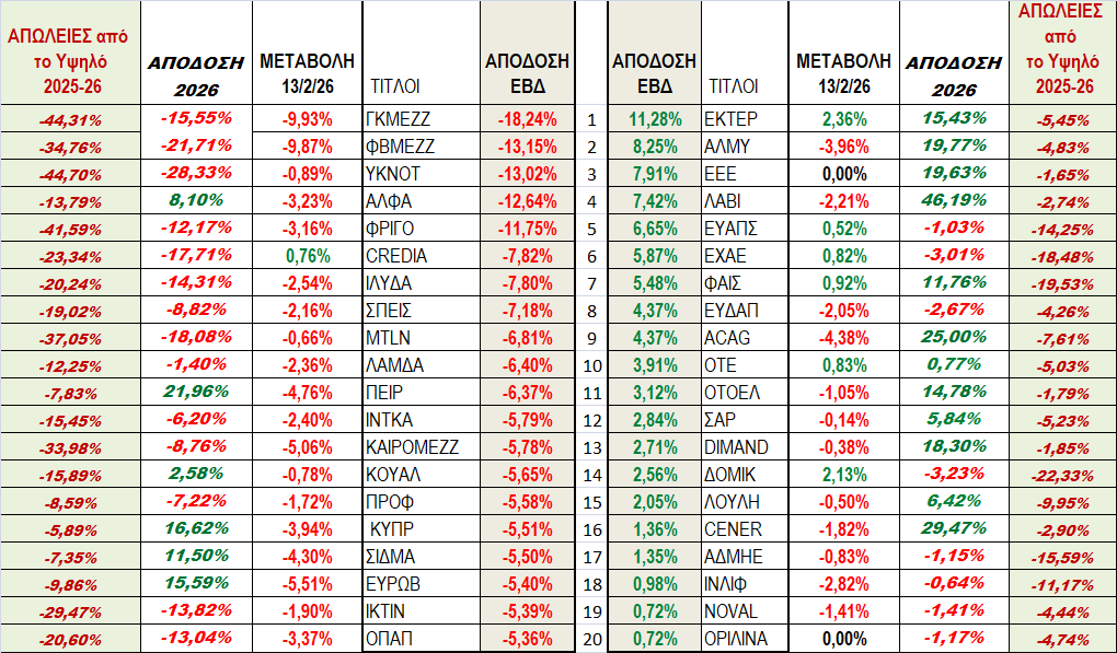 Από τους 89 τίτλους είχαμε θετικό κλείσιμο μόνο σε 10 έναντι 72 αρνητικών στο ημερήσιο ενώ στο εβδομαδιαίο είχαμε 21 θετικούς έναντι 65 αρνητικών. Τις καλύτερες και τις χειρότερες αποδόσεις της εβδομάδας μπορούμε να τις δούμε στο πινακάκι που ακολουθεί: