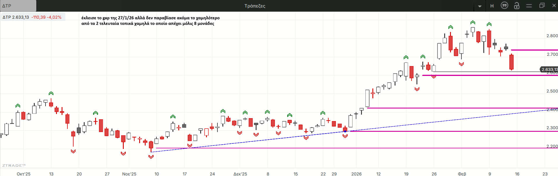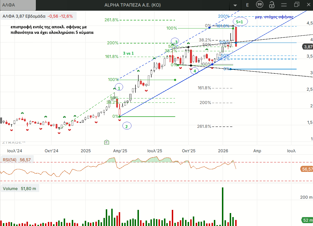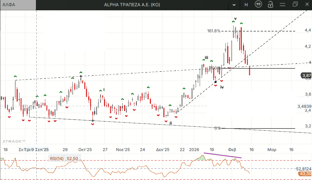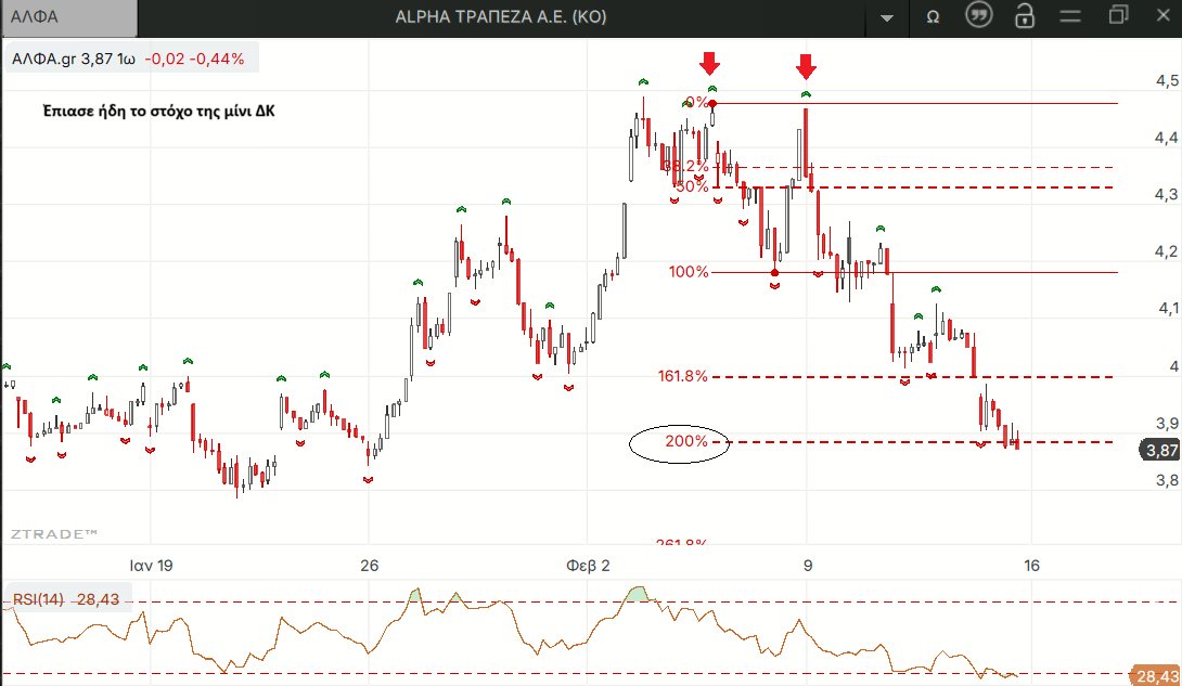 Στην ΑΛΦΑ δεν παραβιάστηκε το χαμηλότερο από τα δυο τελευταία τοπικά χαμηλά αν και το κλείσιμο της εβδομάδας είναι πολύ κοντά μετά την μεγάλη εβδομαδιαία πτώση μακράν τη χειρότερη από όλα τα βαριά χαρτιά.