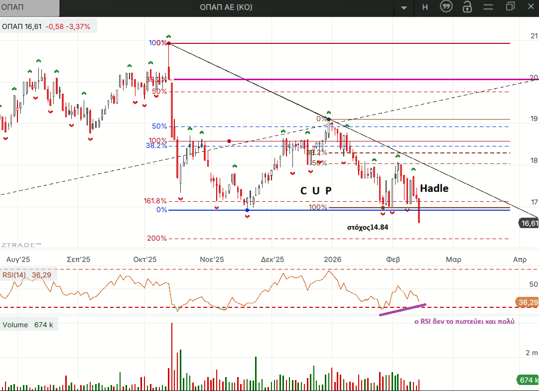 Ενεργοποίηση του κακού από τα σενάρια που είχαν παρουσιαστεί, του πτωτικού σχηματισμού ανάποδης κούπας με στόχους που μου φαίνονται υπερβολικοί λόγω και της θετικής απόκλισης είχαμε και στον ΟΠΑΠ που ήταν έτσι κι αλλιώς σε πτωτική τάση σε όλα τα ημερήσιο κι εβδομαδιαίο.