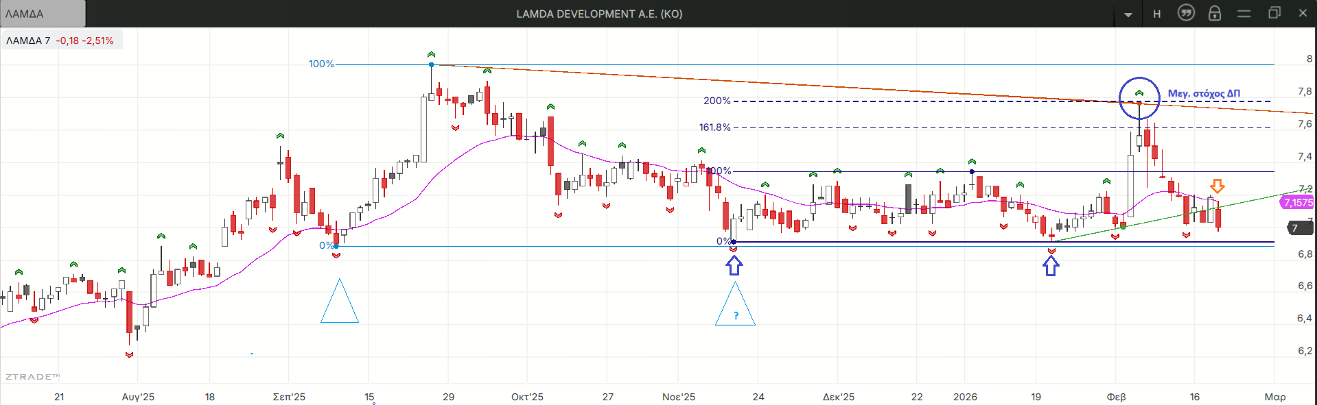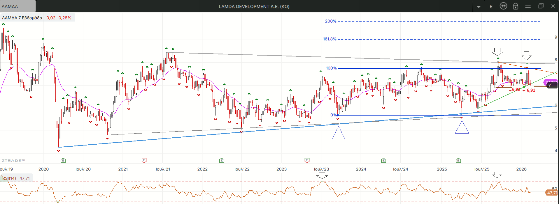 Τυχόν παραβίαση και των 6,91 ευρώ θα είναι ένδειξη καθοδικής αλλαγής της μεσοπρόθεσμης τάσης και ενεργοποίηση σχηματισμού διπλής κορυφής που σηματοδότησε την αποτυχία ενεργοποίησης του μεγαλύτερου διπλού πυθμένα.