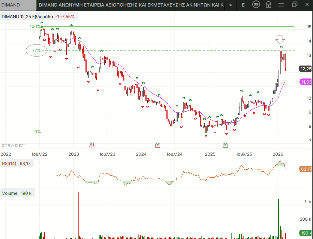 Παραβίαση της οριζόντιας στήριξης του ημερήσιου και ενεργοποίηση σχηματισμού διπλής κορυφής (Δ.Κ) είχαμε και στην DIMAND με θεωρητικό στόχο τα 11,30 ευρώ.