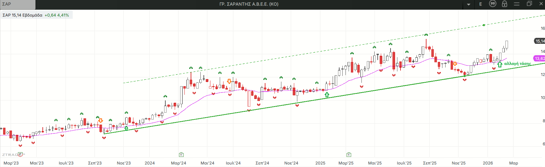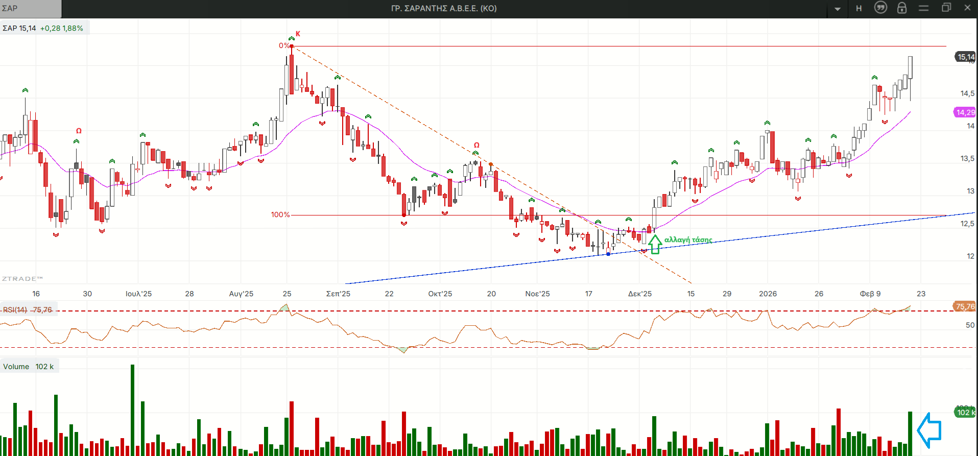 Μια από τις ελάχιστες μετοχές που ξεχώρισαν θετικά κι η μόνη από τον δείκτη μεγάλης κεφαλαιοποίησης με θετικό κλείσιμο ήταν η ΣΑΡ που είναι σε ανοδική τάση σε ημερήσιο κι εβδομαδιαίο κι έχει ακυρώσει τον σχηματισμό καθοδικής αντιστροφής ΩΚΩ που δεν ευδοκίμησε αν κι έμεινε ενεργοποιημένος σχεδόν δυο μήνες στο τέλος του 2025. Εμφαντική η χθεσινή άνοδος κόντρα στο κλίμα με μεγάλη αύξηση του όγκου συναλλαγών.