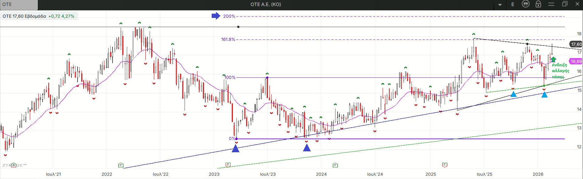 Στον αντίποδα ο ΟΤΕ πέτυχε το στόχο του τελευταίου ανάστροφου ΩΚΩ του και έκλεισε πάνω από την οριζόντια αντίσταση του εβδομαδιαίου ενεργοποιώντας ένα σχηματισμό διπλού πυθμένα (Δ.Π) με στόχο υψηλότερα αυτού του μεγαλύτερου Δ.Π που είναι ενεργοποιημένος από τον Σεπτέμβριο του 2024 και κοντεύαμε να τον ξεχάσουμε.