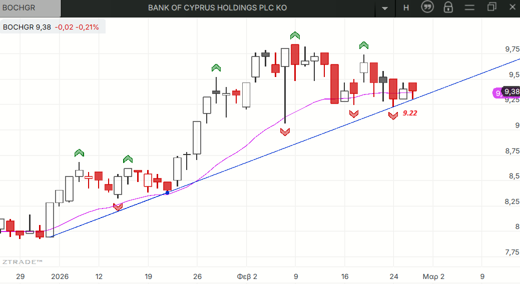 H ΚΥΠΡ ήταν η μόνη με αρνητικό πρόσημο αλλά βρήκε 2η φορά στήριξη στη γραμμή της βραχυπρόθεσμης τάσης και ολοκλήρωσε το σχηματισμό νέου τοπικού χαμηλού στα 9,22 ευρώ που είναι το επίπεδο της οριζόντιας στήριξης του ημερήσιου από σήμερα