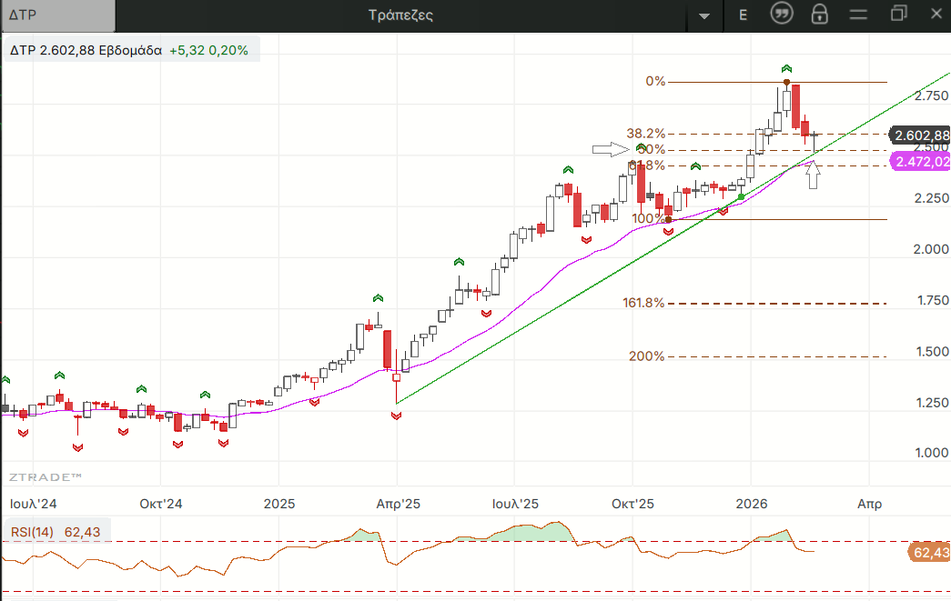 Όπως βλέπουμε στο εβδομαδιαίο διάγραμμα εκτός από την γραμμή τάσης οι τιμές πάτωσαν στο 50% διόρθωσης του τελευταίου ανοδικού από τα χαμηλά του Νοεμβρίου χωρίς να πλησιάσουν καν τον εβδομαδιαίο 20ρη κινητό.