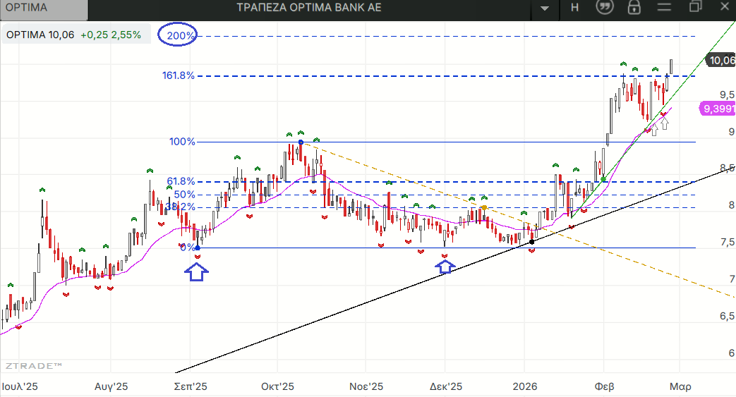 Η ΟΡΤΙΜΑ ανέβασε επίσης την οριζόντια στήριξή της στα 9,21 ευρώ αλλά άφησε πίσω της τον 1ο στόχο του διπλού πυθμένα της και οδεύει προς τον μέγιστο με νέο ιστορικό υψηλό