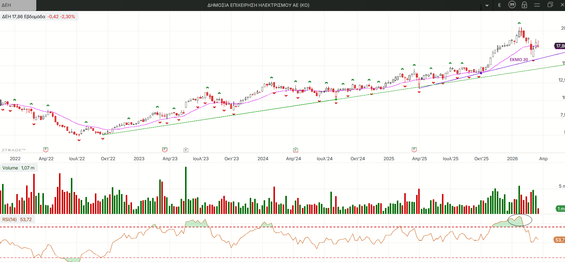 Σε συνέχεια των πολύ ενδιαφερουσών κυματικών εκτιμήσεων που ανέβηκαν εδώ κι εδώ στην προηγούμενη ανάρτηση για τη ΔΕΗ θα ρίξουμε μια ματιά στη μεγάλη εικόνα που παραμένει ανοδική με τις τιμές να διορθώνουν αφού έφθασαν βαθιά στην υπεραγορασμένη ζώνη του μηνιαίου κι εβδομαδιαίου RSI, και σε πιθανά σημαντικά επίπεδα fibo επέκταση ανοδικών κυμάτων με μακροπρόθεσμους στόχους ανοδικούς να εκκρεμούν.