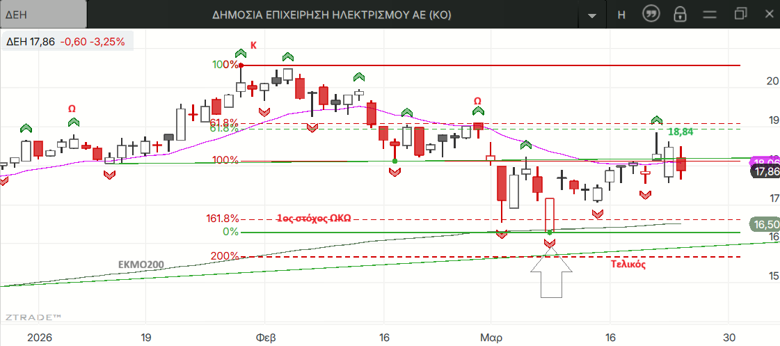 Στο ημερήσιο η τάση είναι καθοδική με τις τιμές να αντιδρούν λίγο κάτω από τον 1ο στόχο του ΩΚΩ μόλις ήρθαν σε επαφή με τον εκθετικό 200ρη και να φθάνουν ως τα 18,84 ευρώ λίγο πριν το 61,8% διόρθωσης όλης της καθοδικής κίνησης. Υπέρβαση αυτού του τοπικού υψηλού ο σχηματισμός του οποίου ολοκληρώθηκε χθες  θα είναι ένδειξη αλλαγής της ημερήσιας τάσης σε ανοδική.