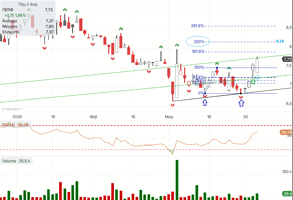 Επιβεβαίωση της αντίστοιχης ένδειξης είχαμε και στην ΠΕΡΦ με την ενεργοποίηση ενός μικρού σχετικά σχηματισμού διπλού πυθμένα με στόχο στα 8.18 ευρώ.