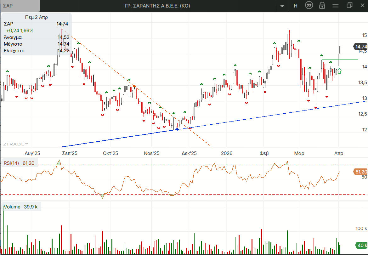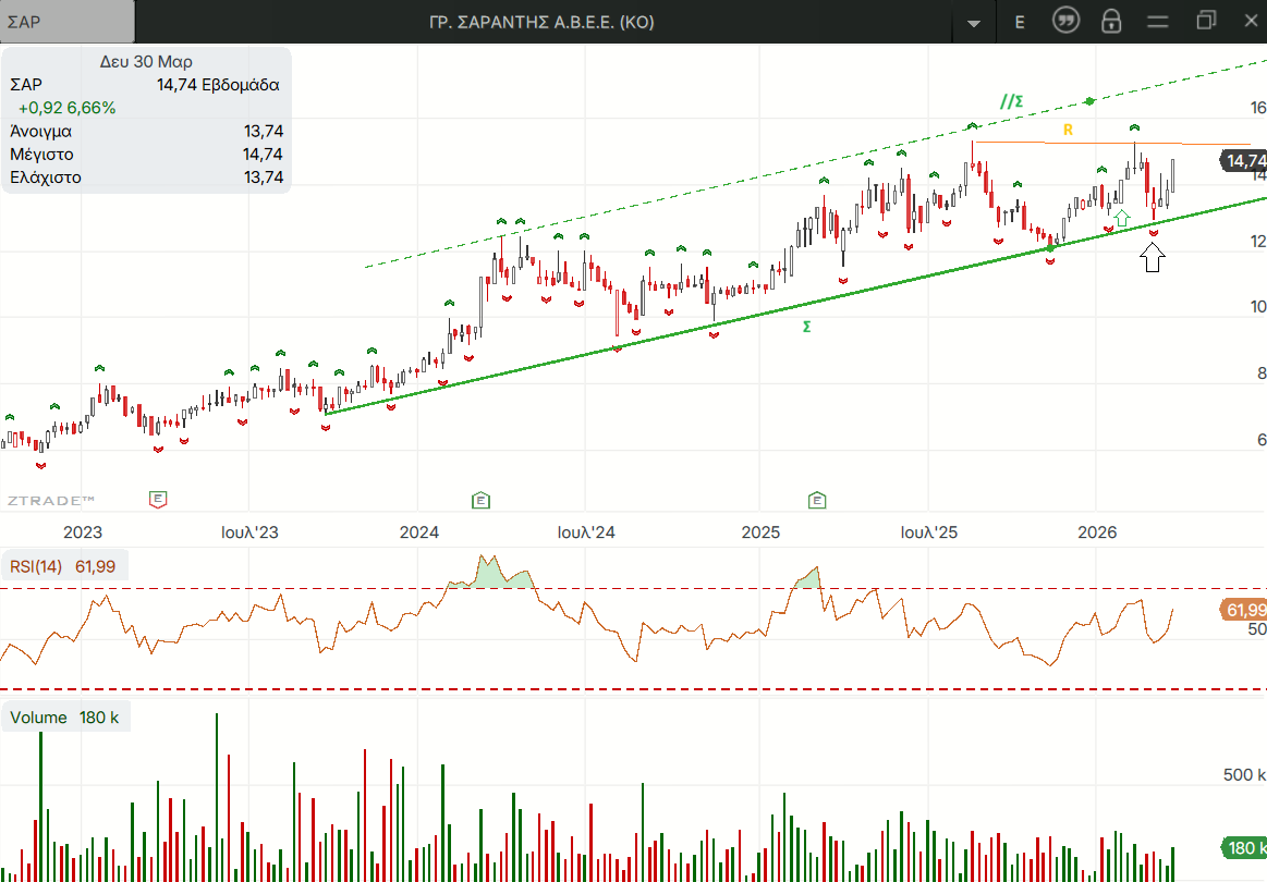 Επιβεβαίωση της χθεσινής ένδειξης αλλαγής της τάσης στο ημερήσιο σε ανοδική όπως παρέμεινε και στο εβδομαδιαίο παρά την πτώση δυο εβδομάδων. Τυχόν διάσπαση της R θα είναι το επόμενο βήμα για νέα υψηλά με πιθανό προορισμό την παράλληλη της δοκιμασμένης ανοδικής γραμμής της μακροπρόθεσμης τάσης Σ.