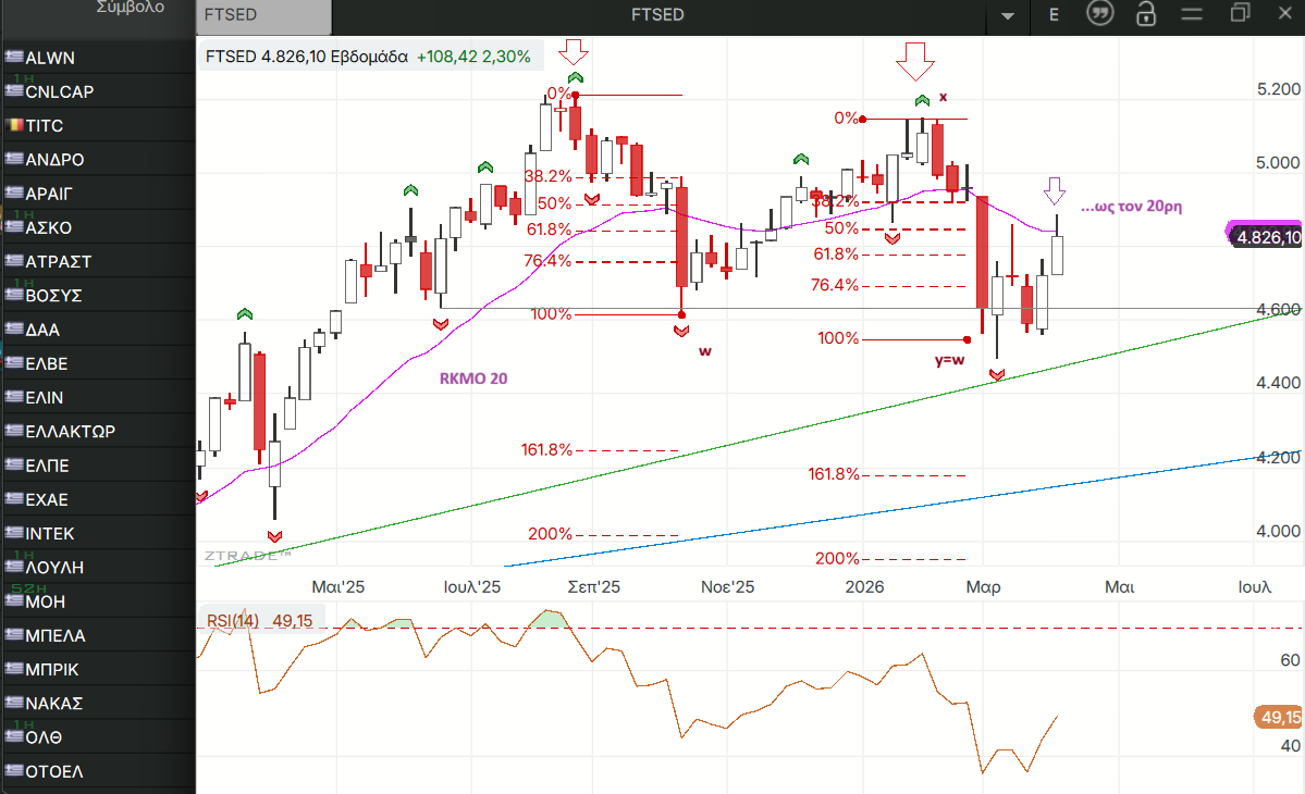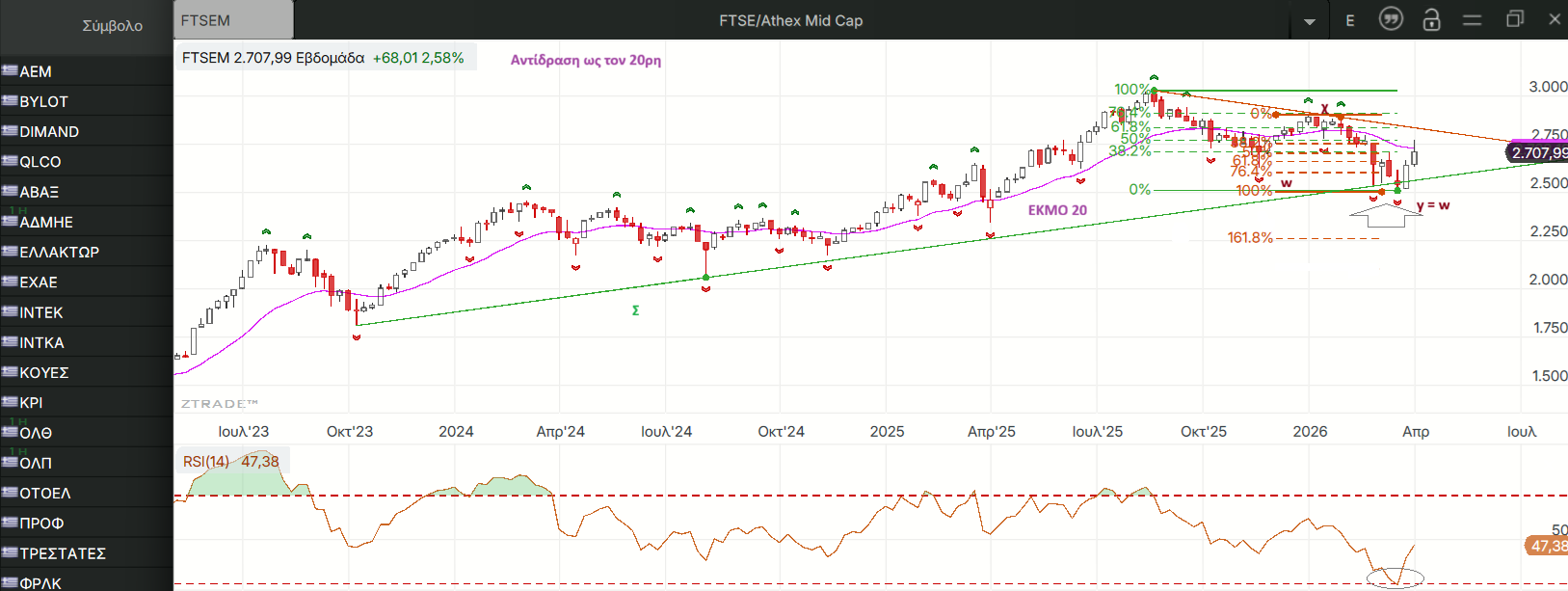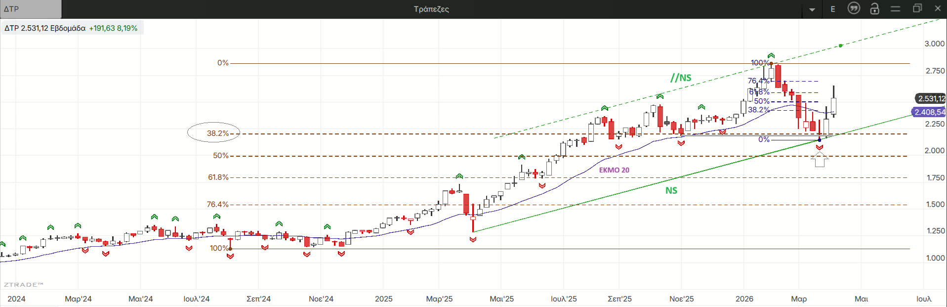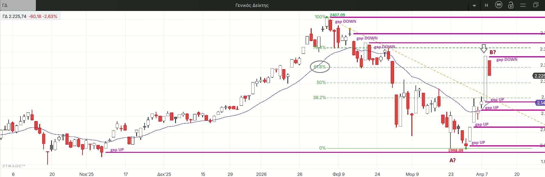 Η πτώση των τιμών του ΓΔ από τα ψηλά των 2407 μονάδων σταμάτησε αφού διόρθωσε κατά 38,2% όλη την άνοδο από τα χαμηλά της διόρθωσης του 2024 (1430 μ. της 2/8). Το χαμηλό των 1998,66 μονάδων της 30/3/26 είναι πλέον το νέο επίπεδο οριζόντιας στήριξης εφόσον διασπαστούν η νέα ανοδική γραμμή τάσης Σ1 που το συνδέει με το χαμηλό της 7/4/25 και η Σ2 που το ενώνει με το χαμηλό των 1948 μονάδων που ήταν το προηγούμενο επίπεδο στήριξης ως το χαμηλότερο των δυο τελευταίων low fractals του εβδομαδιαίου. Η αντίδραση που ξεκίνησε από την αμέσως επόμενη μέρα σταμάτησε μεταξύ των 76,4% και 61,8% fibo επιπέδων διόρθωσης όλης της πτώσης από το πολυετές υψηλό της 4/2/26 με καλή άνοδο που έφερε τις τιμές πάνω από τον εβδομαδιαίο 20ρη μετά από 5 εβδομάδες.