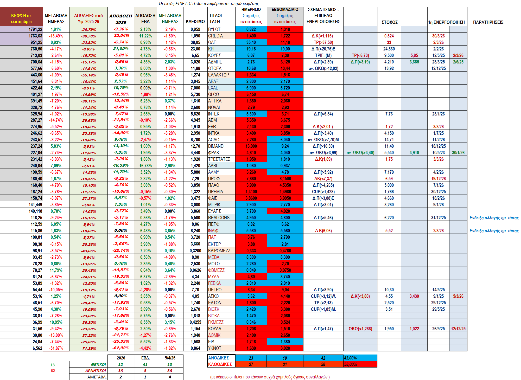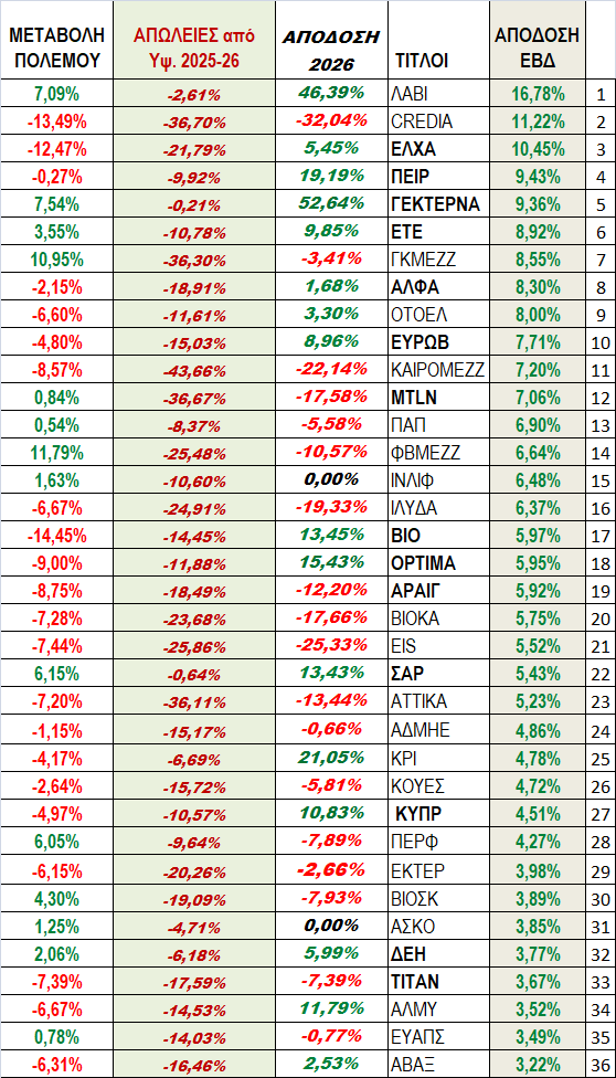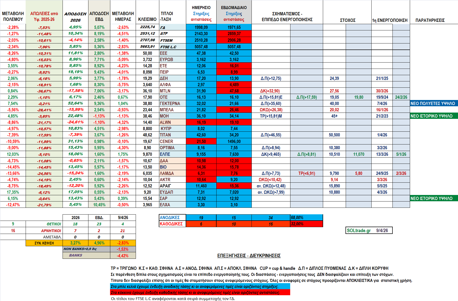 Στους πίνακες που ακολουθούν μπορούμε να δούμε μια συνοπτική ανασκόπηση με στατιστικά, αποδόσεις και απολογισμό τόσο για την συνεδρίαση της 9/4 όσο και για την τριήμερη εβδομάδα αλλά τις αποδόσεις για όλο το 2026 καθώς και τις 6 εβδομάδες από την έναρξη του πολέμου αλλά και τη διόρθωση από τα υψηλά που είδαν οι μετοχές τους τελευταίους 15 μήνες.
