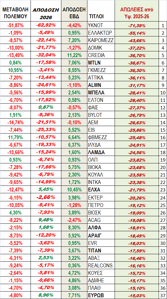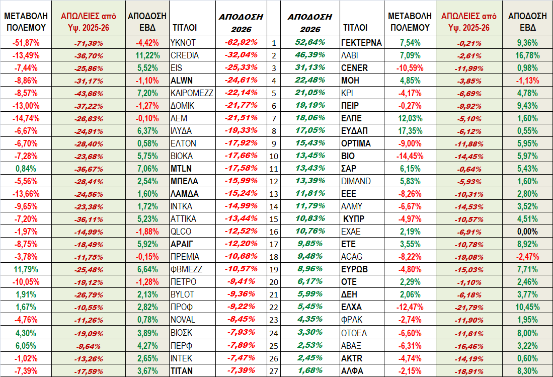 Στην τελευταία λίστα μπορούμε να δούμε τις καλύτερες και τις χειρότερες αποδόσεις από την αρχή της χρονιάς.