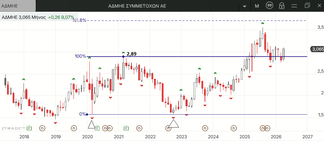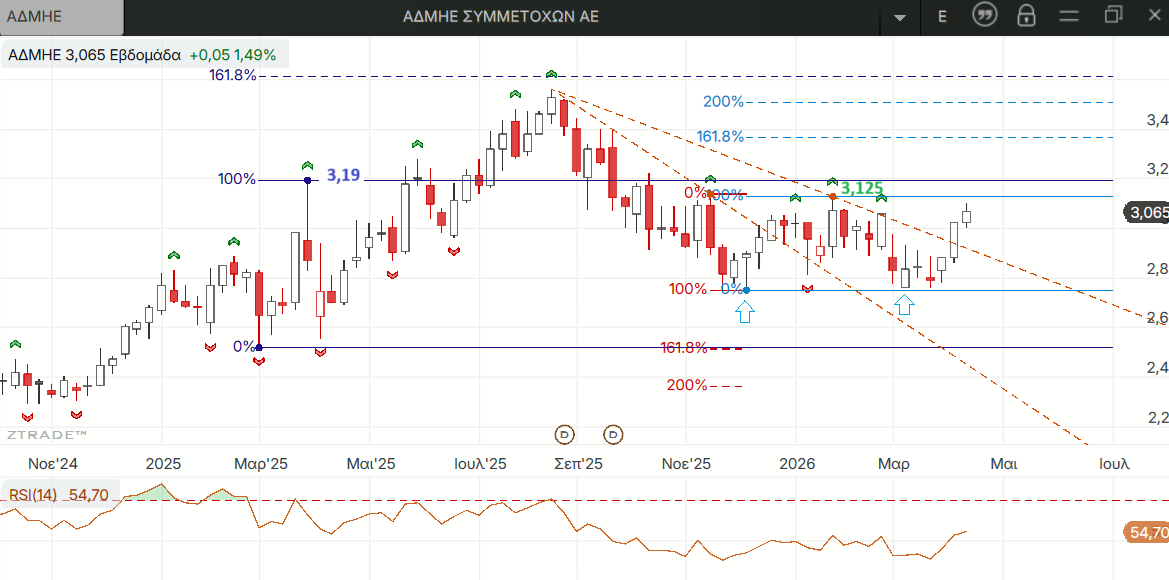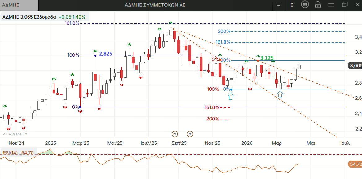 Στα χαμηλά της πρόσφατης διόρθωσης που σημειώθηκαν πριν 5 μήνες οι τιμές απώλεσαν το 40% των κερδών από τα χαμηλά του 2022. Έκτοτε έχουμε πλάγια ατασική κίνηση χωρίς να διασπάται το χαμηλό των 2,75 ευρώ ούτε και το υψηλό της στα 3,125 που προαναφέρθηκαν. Οι τιμές χθες στο κλείσιμο είχαν απώλειες 13,90% από το ιστορικό υψηλό των 3,56 ευρώ.