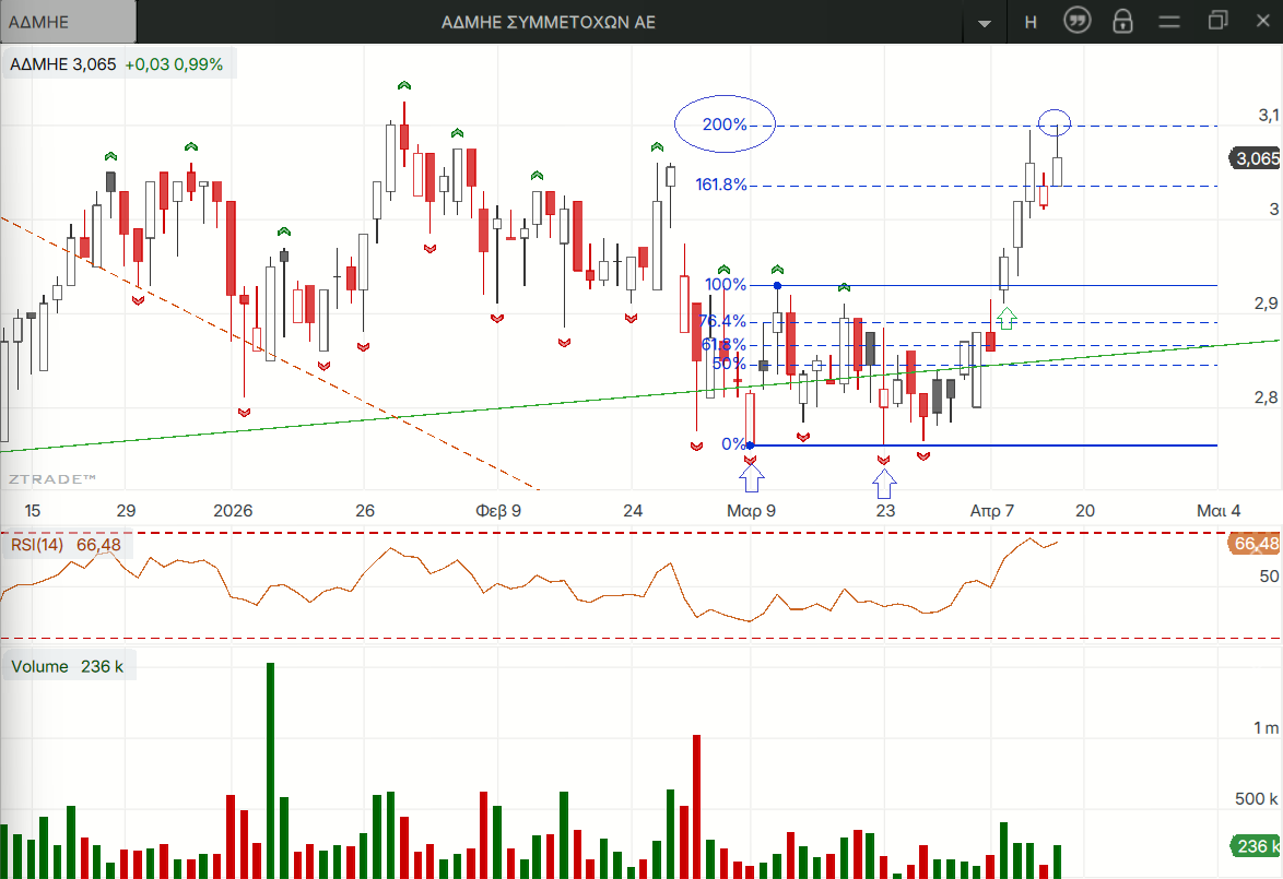 Από την ενεργοποίηση του μικρότερου από τους ανοδικούς σχηματισμούς των τιμών της μετοχής που ήταν και ένδειξη επιστροφής σε ανοδική τάση η οποία δικαιώθηκε πλήρως χρειάστηκαν 5 συνεδριάσεις μέχρι την χθεσινή επίτευξη του μέγιστου στόχου.