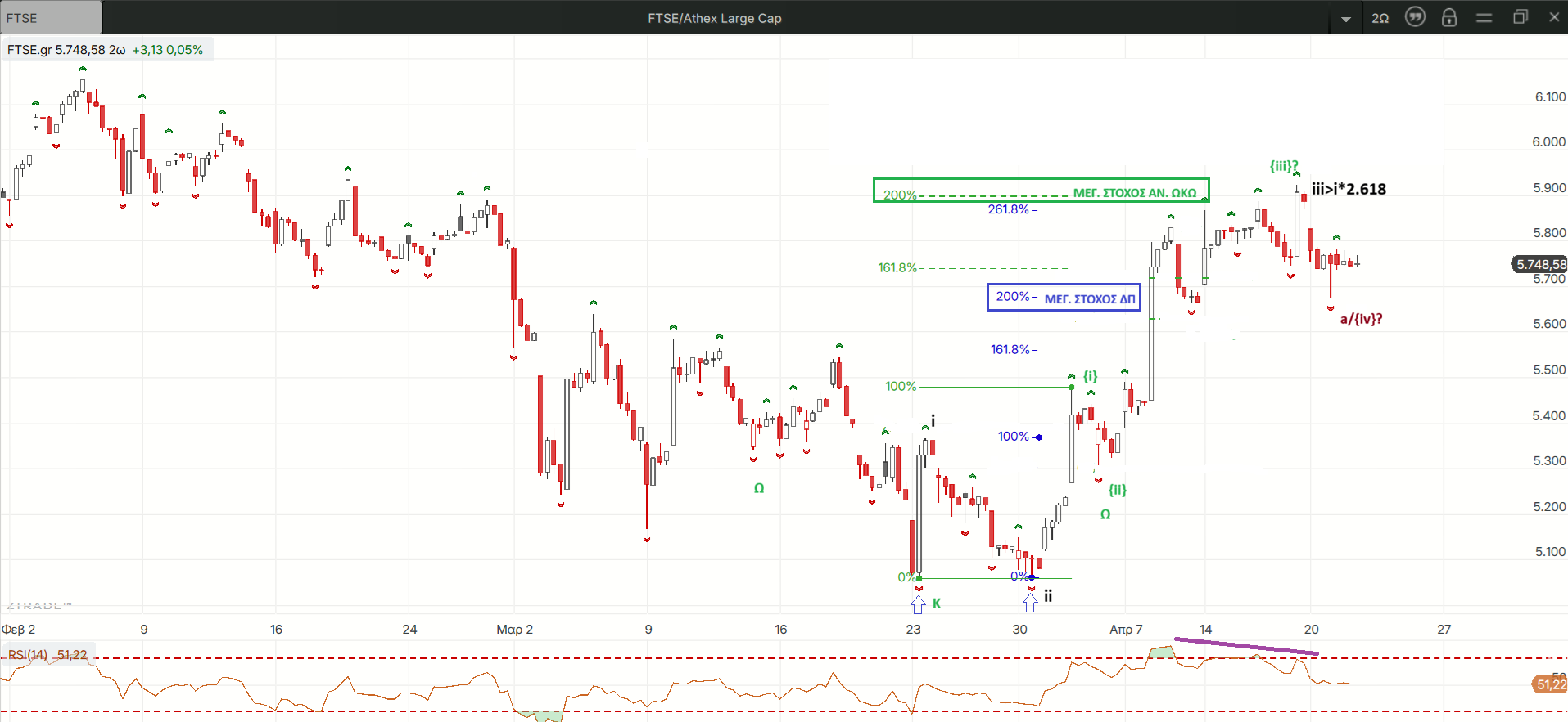 Στο 120λ διάγραμμα που ακολουθεί υπάρχει ένα κυματικό σενάριο για την τελευταία άνοδο ως αφορμή για συζήτηση με τους κυματιστές μας. Επισημαίνεται ότι οι ανοδικοί σχηματισμοί που είχαν παρουσιαστεί σε προηγούμενες αναρτήσεις έχουν ήδη πιάσει τους στόχους τους, με τον RSI να εμφανίζει την πρώτη αρνητική απόκλιση.