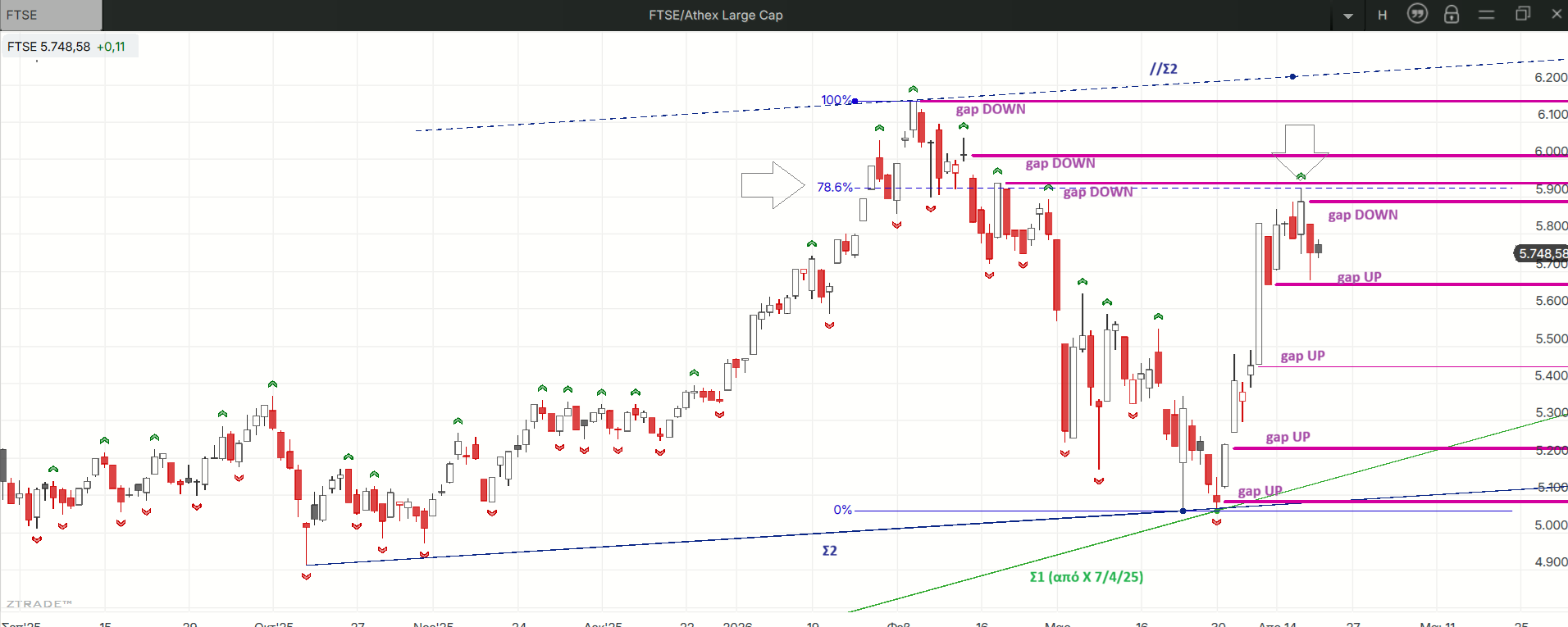Η τάση είναι ανοδική και τυπικά από τις 8 Απριλίου και στο ημερήσιο στο οποίο βλέπουμε 4 ανοδικά και 4 καθοδικά gaps να παραμένουν ανοικτά και οι μωβ γραμμές απεικονίζουν τα επίπεδα που κλείνουν. Για την ώρα δεν είχαμε σχηματισμό κάποιου τοπικού χαμηλού κατά την ανοδική αντίδραση(;) οπότε η οριζόντια στήριξη με βάση τα fractals είναι η ίδια με το εβδομαδιαίο στις 5057,48 μονάδες.