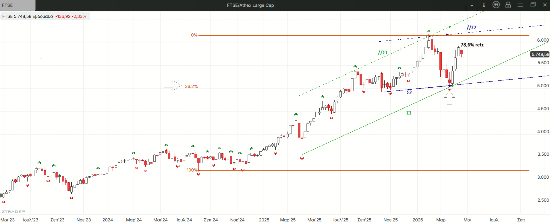 Η τάση είναι ανοδική τόσο στο μηνιαίο όσο και στο εβδομαδιαίο διάγραμμα στο οποίο το χαμηλό του Μαρτίου είναι ήδη η οριζόντια στήριξη ως το χαμηλότερο των δυο τελευταίων εβδομαδιαίων τοπικών χαμηλών (low fractals). Η αντίδραση από αυτό το χαμηλό σταμάτησε για την ώρα αφού διόρθωσε κατά 78,6% όλο το πτωτικό από τα υψηλά έτους, με τις τιμές πλέον πολύ μακριά από τις γραμμές τάσης Σ1 & Σ2 όπως και από τους μηνιαίους ΕΚΜΟ 6Χ και ΕΚΜΟ 12 με τους οποίους αναμετρήθηκαν τον Μάρτιο.