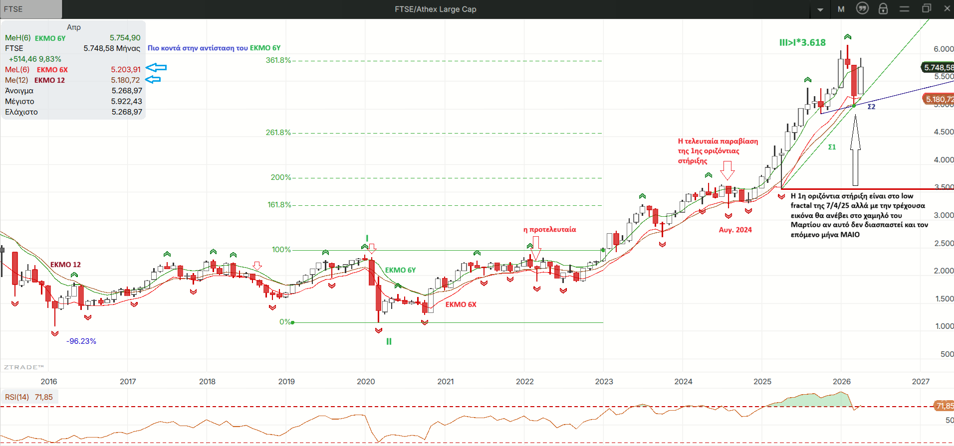 7 συνεδριάσεις πριν το τέλος του μήνα κι οι τιμές καταγράφουν σημαντική μέχρι στιγμής άνοδο διαγράφοντας όλες τις απώλειες της βουτιάς του Μαρτίου οπότε διόρθωσαν ως το 38,2% όλη την άνοδο από τα χαμηλά του Αυγούστου του 2024, ίσως στο πρώτο από τα τρία διορθωτικά κύματα ενός πιθανού μεγάλου κύματος ΙV σύμφωνα με το κυματικό σενάριο του μηνιαίου. Το χαμηλό του Μαρτίου ήταν το πρώτο που διέσπασε τα δυο προηγούμενα μηνιαία χαμηλά από τον Απρίλιο του 205, οπότε δεν αποκλείεται να εξελιχθεί σε πολύ σημαντικό μηνιαίο low fractal σύμφωνα με τις σημειώσεις στο μηνιαίο διάγραμμα.