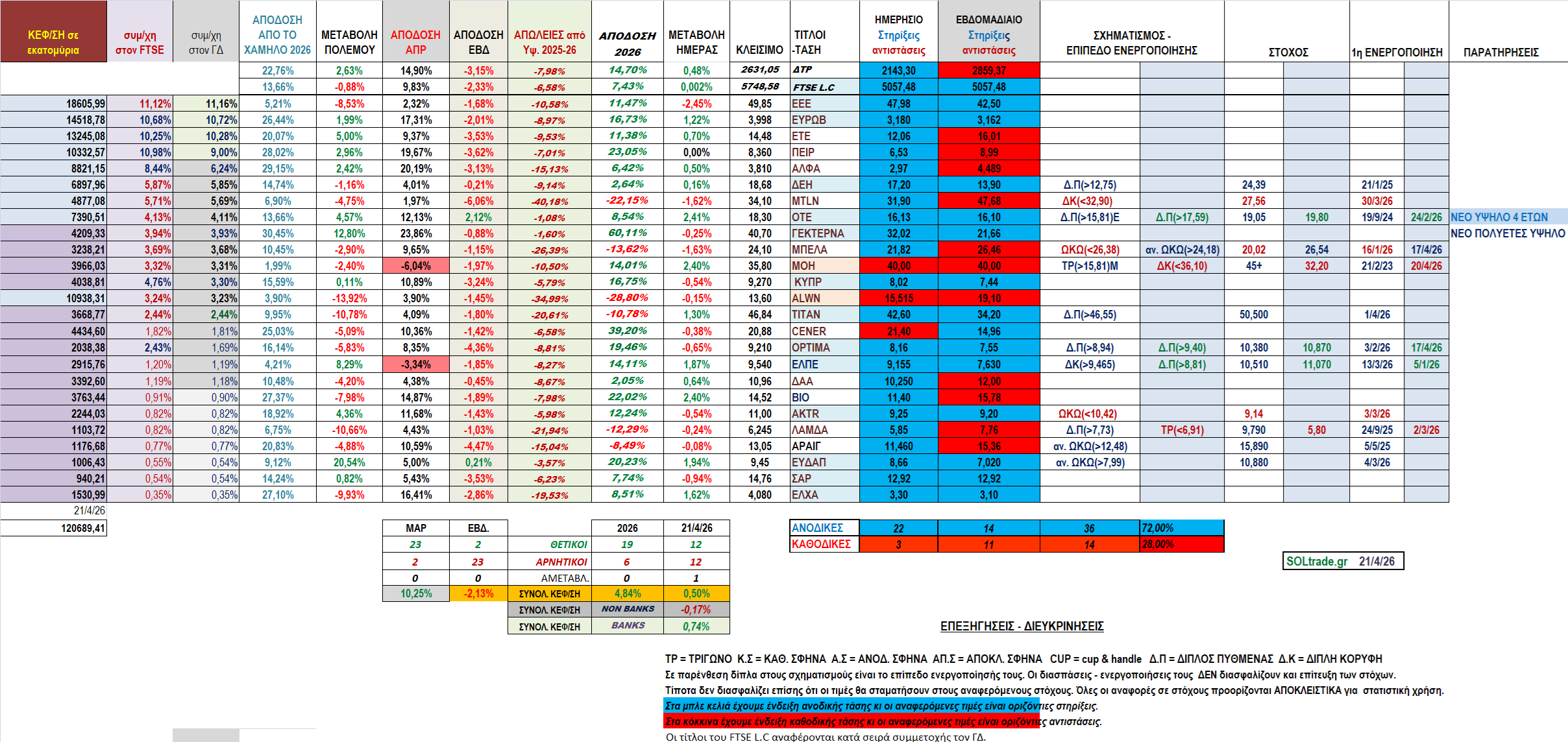 Στις πρώτες στήλες μπορούμε να δούμε την κεφαλαιοποίηση των τίτλων στο χθεσινό κλείσιμο και τα ποσοστά συμμετοχής τους στον δείκτη και τον ΓΔ επικαιροποιημένα το ΣΚ. Μπορούμε επίσης να δούμε εκτός των χθεσινών αποδόσεων και τις αποδόσεις των πρώτων δυο συνεδριάσεων της εβδομάδας, τις ως τώρα αποδόσεις του Απριλίου και της πολεμικής περιόδου από την 1/3/26, τις αποδόσεις του νέου έτους και τα ποσοστά διόρθωσης των τιμών από τα υψηλά των 16 τελευταίων μηνών και τα χαμηλά της τελευταίας διόρθωσης.
