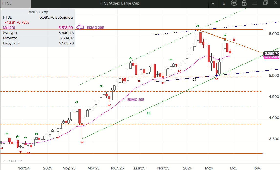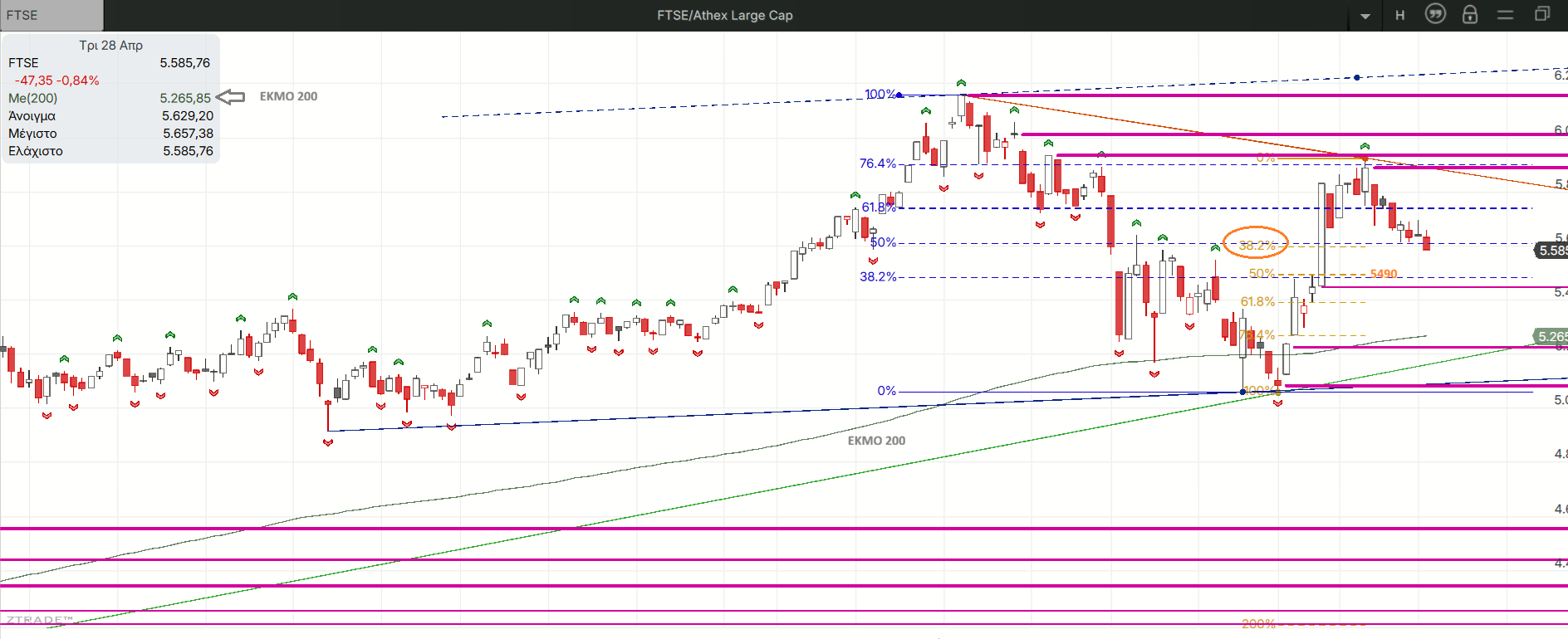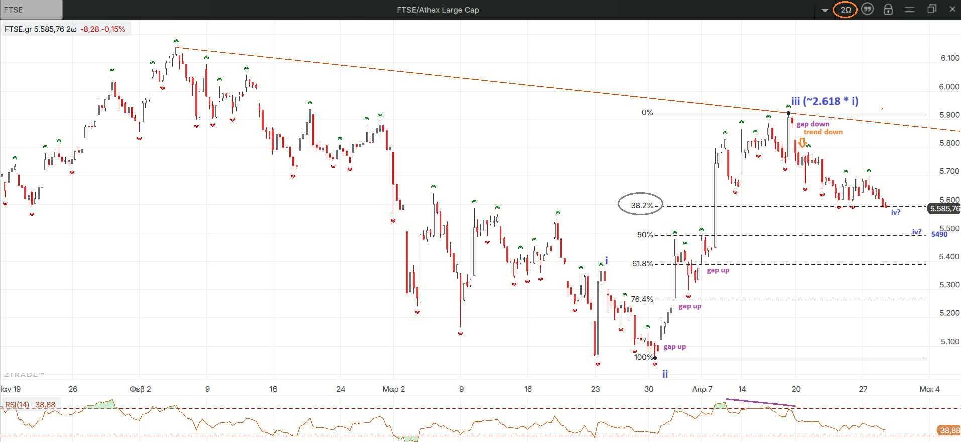 Οι τιμές για την ώρα σταμάτησαν στην περιοχή του 38,2% fibo διόρθωσης του τελευταίου ανοδικού κύματος περίπου ενώ το επόμενο επίπεδο 50% είναι λίγο κάτω από τις 5500 μονάδες κάτω από τον εβδομαδιαίο 20ρη. Εκεί βρίσκεται και η πρώτη γραμμή στήριξης κι αν χαθεί δεν θα μιλάμε πιθανότατα για κύμα iv και τα ενδεχόμενα επίπεδα στήριξης θα είναι τα ανοδικά gaps χαμηλότερα από το 61.8% και βέβαια η Σ1 και Σ2 της μεγαλύτερης εικόνας είναι οι τελευταίες στηρίξεις πριν το καθοριστικό χαμηλό του Μαρτίου που θα απειληθούν αν η ανοδική διόρθωση έχει ολοκληρωθεί στο τελευταίο υψηλό.