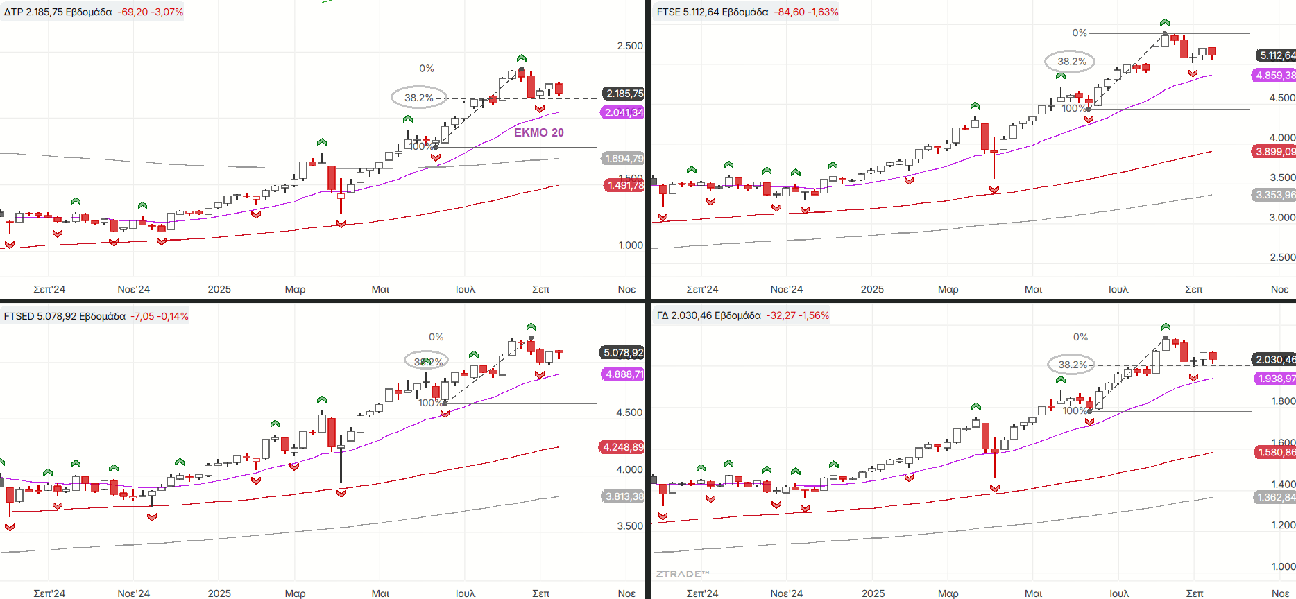 Εβδομάδα απωλειών για τους μεγάλους δείκτες της αγοράς ο τιμές των οποίων ολοκλήρωσαν το σχηματισμό ενός νέου low fractal στο εβδομαδιαίο διάγραμμά τους κι έτσι η οριζόντια στήριξη από το χαμηλότερο των δυο τελευταίων ανέβηκε στο χαμηλό του Ιουνίου από το χαμηλό του Απριλίου. Ο εβδομαδιαίος 20ρης που είναι το πρώτο alarm για τη μεσοπρόθεσμη τάση δεν προσεγγίστηκε καν και δεν διασπάστηκε το 38,2% fibo διόρθωσης όλης της ανοδικής κίνησης από το χαμηλό του Ιουνίου. Διαβάστε περισσότερα