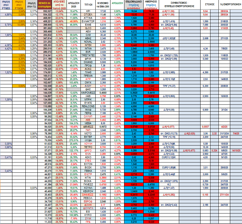 Δεύτερη μέρα στο κόκκινο με τους ΓΔ, FTSE L.C να πέφτουν με πτωτικό χάσμα και επιδείνωση της τεχνικής εικόνας με τις καθοδικές ενδείξεις να πληθαίνουν αν και είναι ακόμα μειοψηφικές όπως βλέπουμε στο πινακάκι συνοπτικής ανασκόπησης όπου παρουσιάζονται κατά σειρά ειδικού βάρους στους δείκτες οι τίτλοι του δείκτη μεγάλης κεφαλαιοποίησης και κατά σειρά κεφαλαιοποίησης οι υπόλοιποι. Στο ημερήσιο οι τίτλοι που έχουν κοκκινίσει είναι ήδη περισσότεροι από τους μπλε. Τα επίπεδα στήριξης όσων τίτλων παραμένουν στο μπλε στο ημερήσιο (44/93 & 7 από τους πρώτους 15 πιο δεικτοβαρείς) εκτιμάται ότι μπορεί να αποκτήσουν ιδιαίτερο ενδιαφέρον λίαν προσεχώς. Το κόκκινο στο κλείσιμο κυριάρχησε χθες σε όλα τα μήκη και τα πλάτη σε μεγάλες και μικρές κεφαλαιοποιήσεις. Μόλις 20 τίτλοι έκλεισαν στο πράσινο, 4 αμετάβλητοι κι οι υπόλοιποι 69 στο κόκκινο όπως κι οι 4 δείκτες.